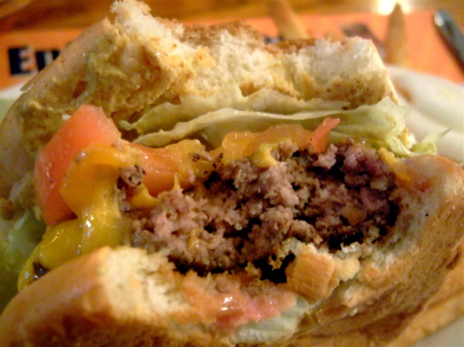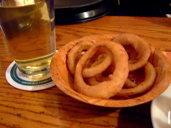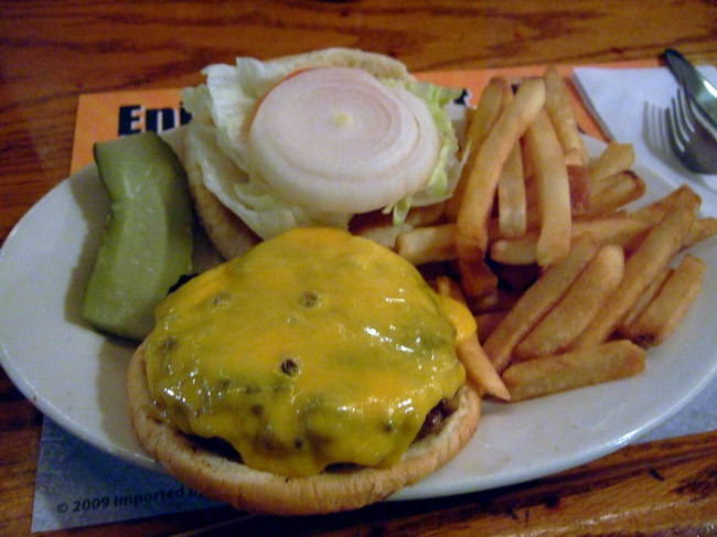 All burgers come deluxe with your choice of fries or onion rings. The deal is $10 for a burger and beer but if you really don’t want a beer then you’ll be happy to know the cheeseburger is only $8.95, the chiliburger is $8.50, and bacon burger is $8.75. I ordered the special but splurged by adding cheddar cheese (plus $1). I’m glad I did because the cheese was just oozing out over the patty and the beef was juicy and hot off the grill.