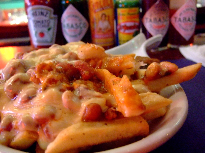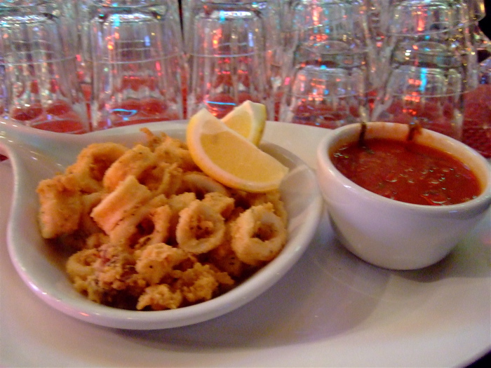 Happy hour (4:30-6:30pm) includes $5 draft beers and a satisfying selection of $5 meals including peel and eat shrimp, jalapeno rings, ½ dozen clams or oysters, and buffalo/BBQ/honey wings. Also on the list were chili cheese fries and fried calamari, which we couldn’t resist.