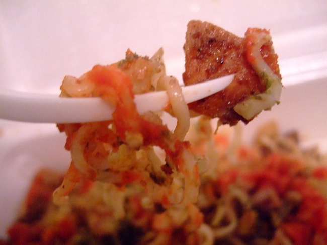 On quick inspection it’s petty obvious this is nothing like what is being served at the Kwik Pasta cart. Fahima’s stir fried noodles seem to be cooked ramen-like noodles given a quick sauté on the griddle then topped with Halal chicken, scrambled egg, some grilled onion and seasoning. If you can’t handle spice make sure to request none of the red and green hot sauce because it adds a serious punch, which I really liked.