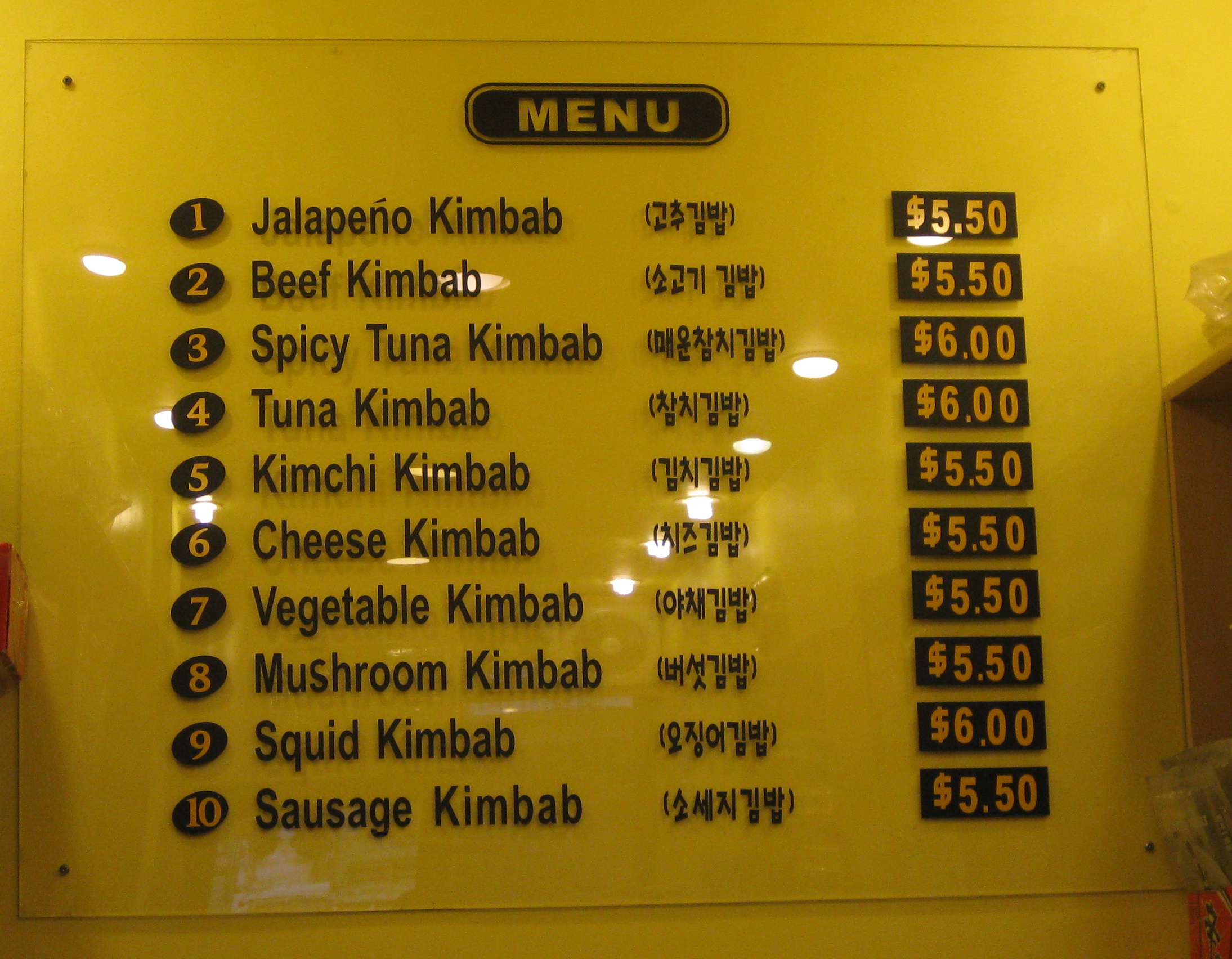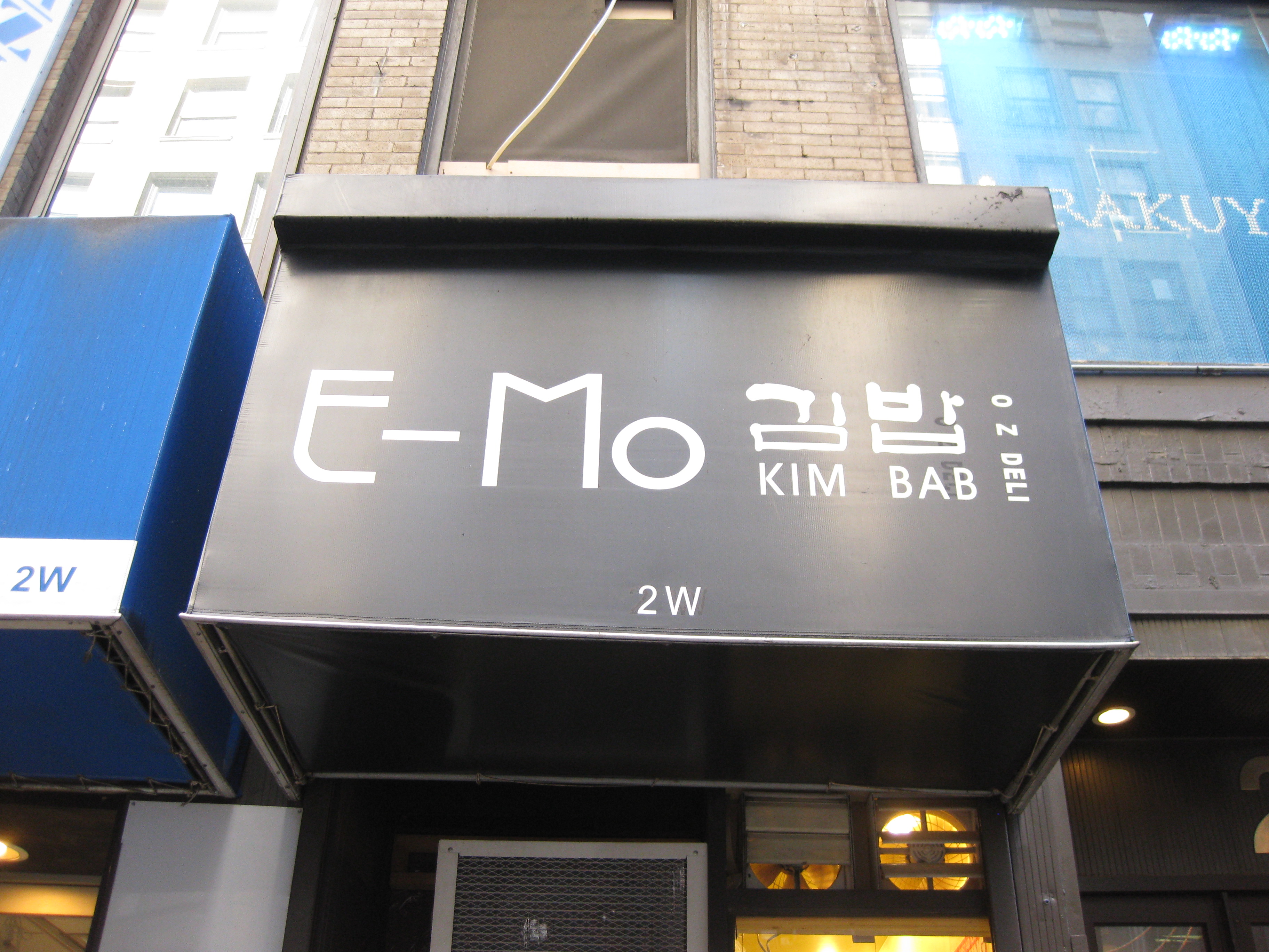 With standing room only and walls the color of your bright yellow pickled daikon, E-Mo (W.32nd St. btw. 5th Ave and B’way), which means “aunt” in Korean, serves up homestyle, made-to-order kimbap from a tiny storefront in Koreatown. E-Mo is by far the most popular place to get “Korean sushi” in Ktown. A cheap, hole-in-the-wall, you’d think it would be a Midtown Lunch classic, but surprisingly hasn’t had its own coverage… ’til now. And come on Zach, it’s secretly a caloric brick.