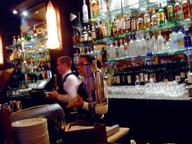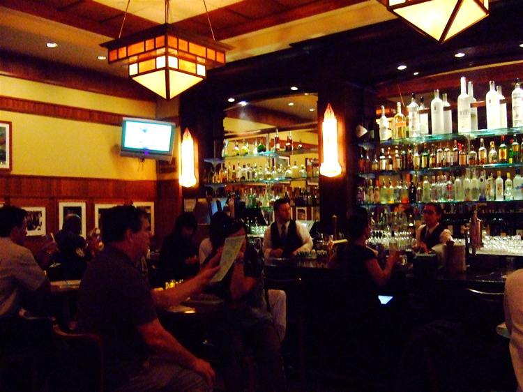 The bar area has the nice distinction of being almost like its own room due to some columns that act as partitions. The rest of the two level dinning is stylish, quiet and accented by art deco stained glass lighting.