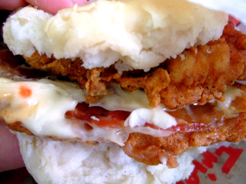 The slogan for KFC’s Double D is, “This product is so meaty, there’s no room for a bun!” Well I beg to differ. There’s always room for some carbs, or in this case a couple of buttermilk biscuits. I stacked them on top and bottom and created my own adaptation and it was pure perfection.