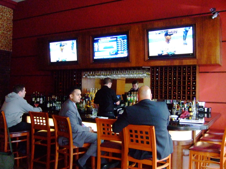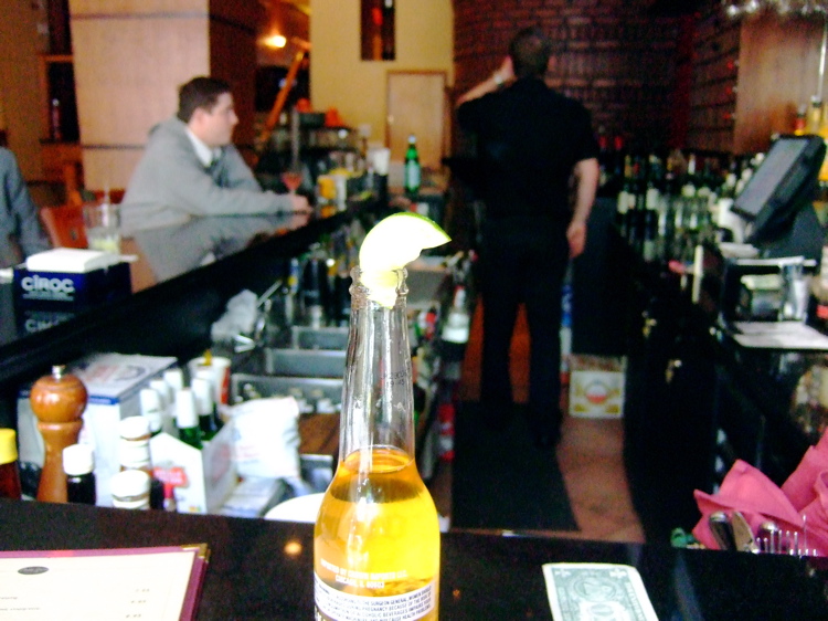 Happy hour is 5 to 8pm with 1/2 off house wine, beers and well drinks making all drinks under $5. While there are no draft beers, the bottle selection includes both domestic and import and should satisfy most drinkers: Bud, Stella, Amstel, Corona.. etc. My Corona with lime came to $4.50 $3.50, not the best deal in midtown but not bad either. The full menu is available at the bar, though most pasta dishes are on the pricy side. If you are so inclined, the personal pizzas start at $10 and make for a serviceable snack to split with a friend while catching the game on the bar’s flat screens. I didn’t bother to check out the dining section and why would you, everything you need is cold and refreshing at the bar, and best of all, available till 8pm. Grab a seat early and settle in!