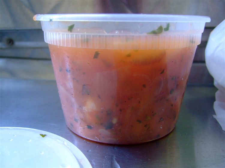 Next up was the ceviche de camarones. The shrimp ceviche wasn’t what I expected, this was more like a shrimp cocktail. The medium sized shrimp are bathed in a very light tomato soup, with no distinctive salty/lime pucker, and a heavy dose of shaved red onion plus a peppering of cilantro. It also came with a container of rice that was a bit on the dry side.