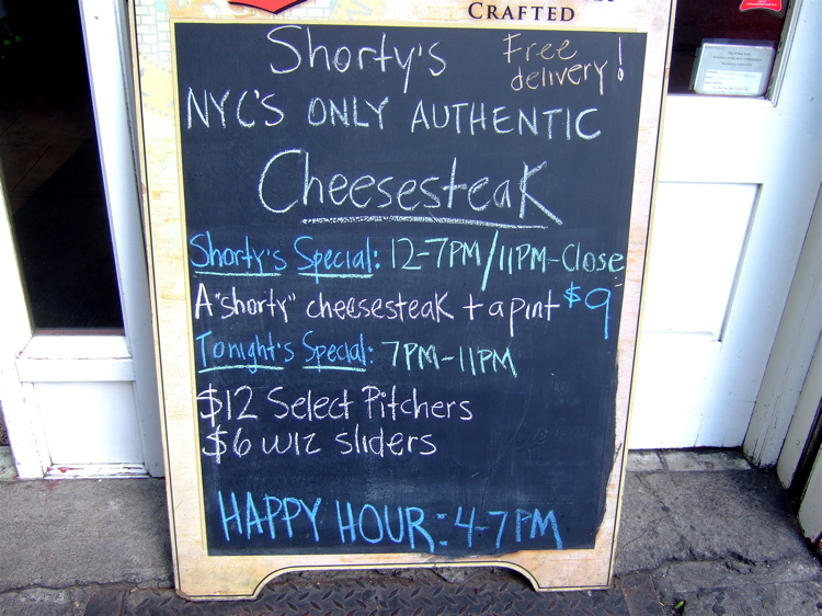 Shorty’s claims to offer the only “authentic” south Philly style sandwiches in NYC. Rather then being a divey lunch counter they have adapted to Hells Kitchen’s unique flavor stepping up their game with a full bar, 22 beers on tap, and a focus on local breweries, craft beers, and cask ales. What caught my eye was their daily cheesesteak and pint special. Now I’ve gone on and on about burger and beer specials in town, but a cheesesteak happy hour? Now you’re speaking my language!