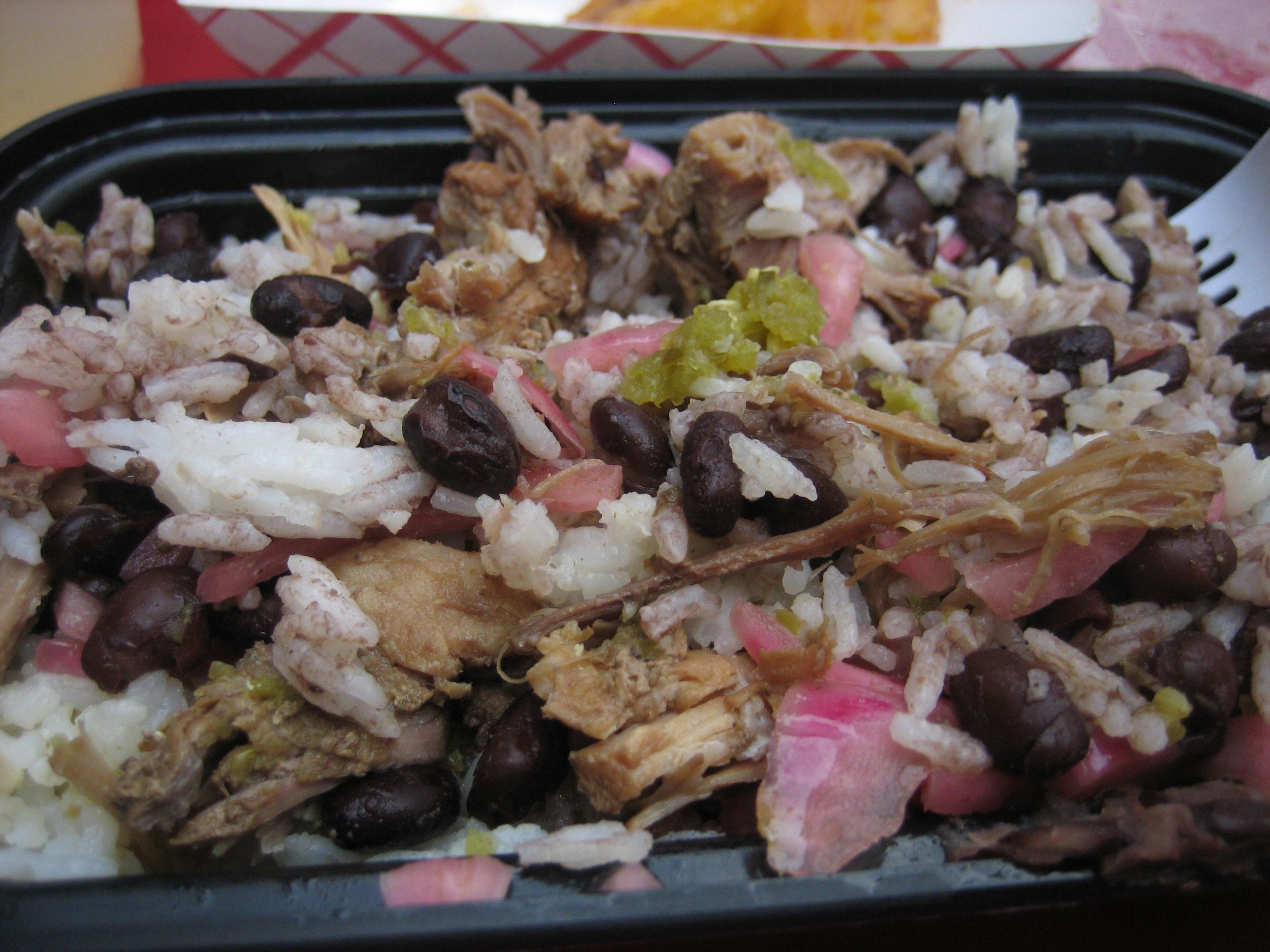 The white rice fills the whole tray and forms a bed onto which everything else is served. The rice was a little on the mushy side but I think that’s a good thing considering all the food it has to stand up to here. The frijoles negros were very flavorful and were actually the highlight of the meal for me (strange, cause I love meat). The onions were crunchy and not too vinegary. They add a nice bit of variety to the plate. For my sauce I chose their jalapeno cilantro aji. It’s a thin, citrus-y sauce with bits of jalapenos and cilantro chopped up in it. It wasn’t the most perfect tasting sauce I’ve ever eaten, but it’s pretty spicy… so in that sense I guess it did its job.
