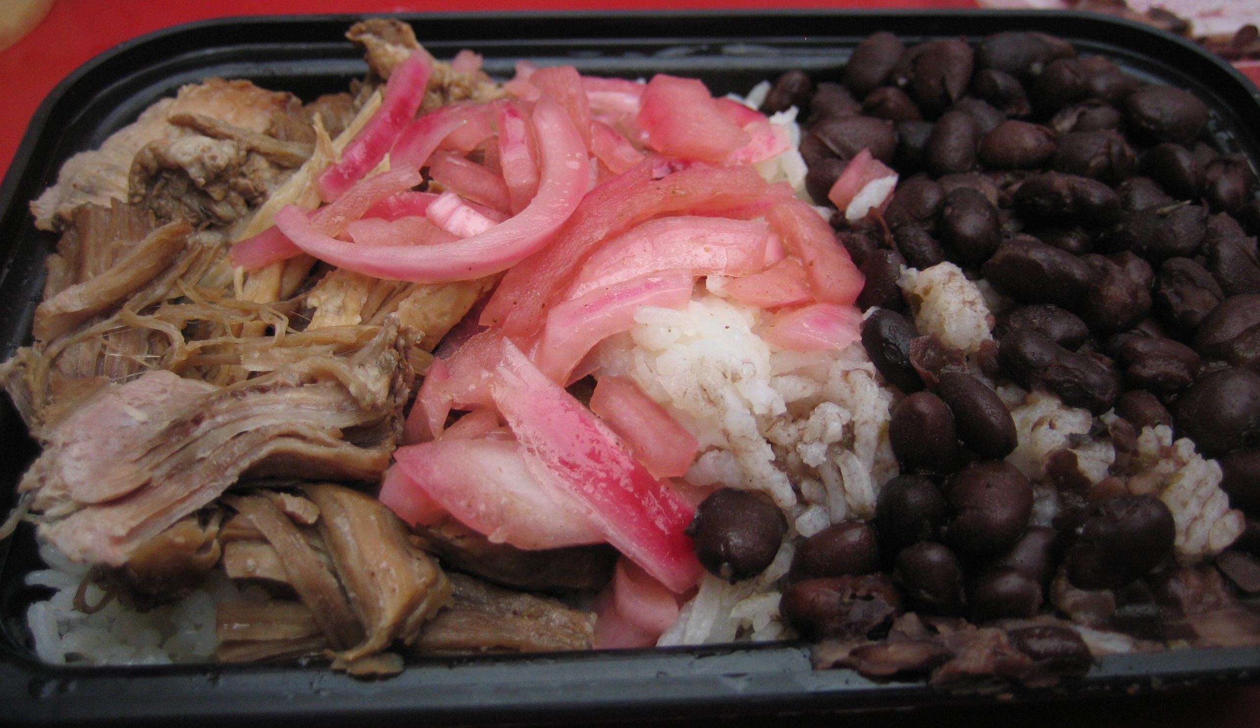On my first visit, I tried their lechon (pulled pork) meal which comes with white rice, frijoles negros, some of their “mojo-pickled onions” and a choice of one of three sauces (guava-habanero BBQ, cool and creamy garlic aioli or jalapeno cilantro aji). According to our good friend wikipedia, “lechon” is a dish that features a whole suckling pig roasted over charcoal… but like most Cuban spots, their version is pretty much just pulled pork. It was moist and tasty but fairly standard overall, and there was no skin or anything- so if you’re hoping for some crispy skin action you might be disappointed.