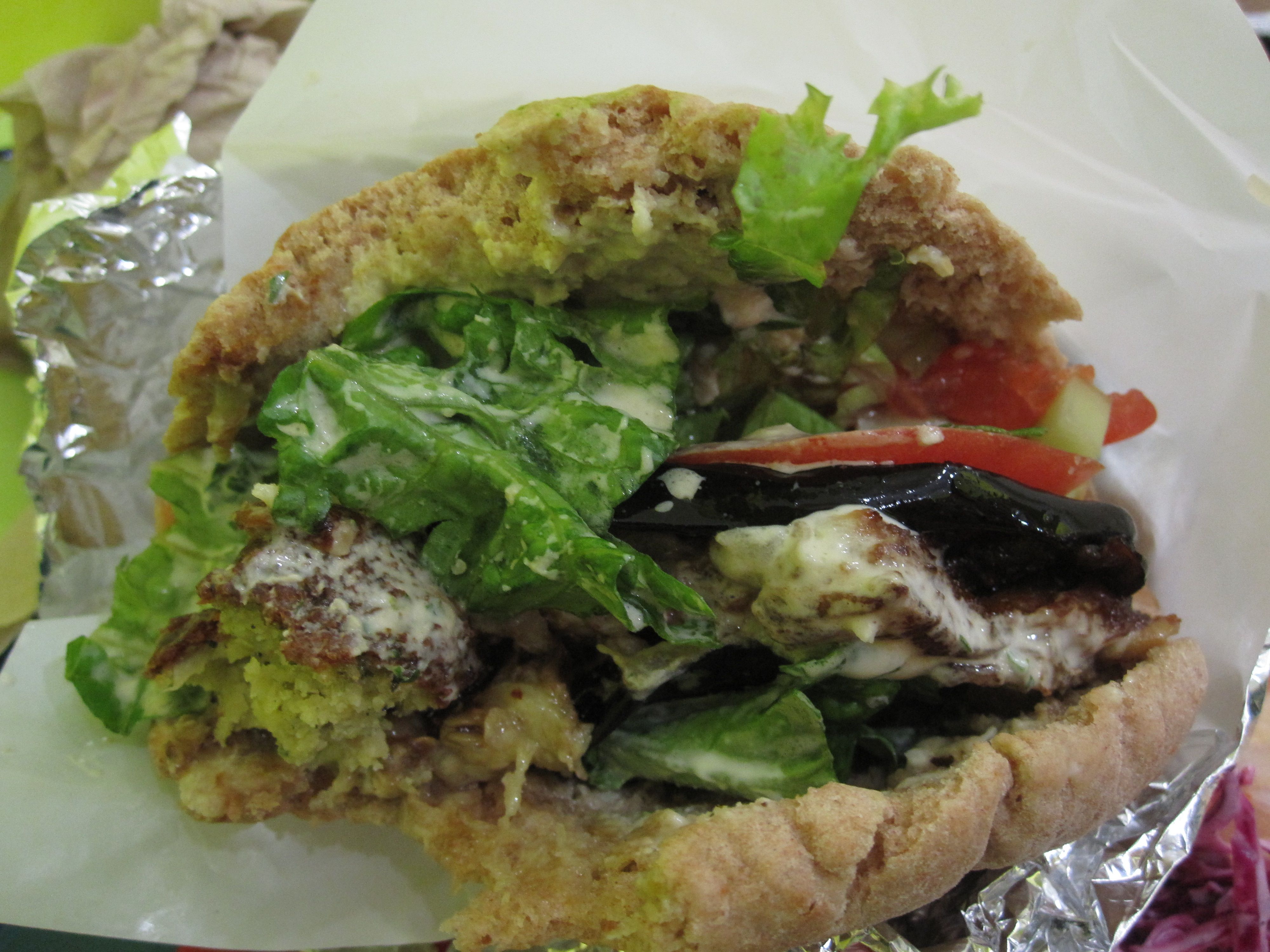 I got the Falafel Deluxe sandwich ($7), which features hummus, eggplant, cubed salad (aka Israeli salad), lettuce and sliced tomatoes. They did a commendable job of construction. Most importantly, they started the sandwich off with a bunch of falafel at the bottom of the pita, and then finished by topping it off with a few more. It was a lot of falafel and you certainly don’t need to worry about eating half of the thing before tasting that fried chickpea goodness. Otherwise, everything was in good proportion and the eggplant provides a nice mushy, fatty-tasting complement to the falafel.