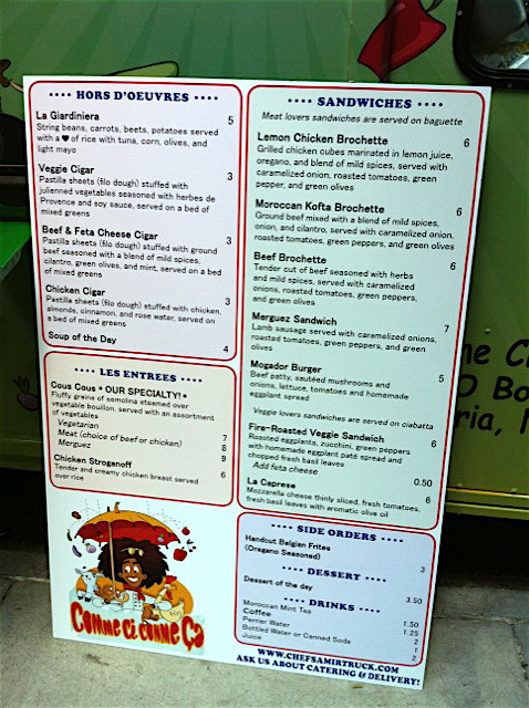 It looks like those of us who miss the days when Le Gamin used to park in Midtown, now have a new truck to stalk. Thanks to Lunch’er Dave for passing along these photos of the new “Comme Ci Comme Ca” truck. Last week it was spotted on 54th and Lex, and Lunch’er “Ceh” seemed to enjoy the merguez and cous cous. Sadly, the owner dislocated his elbow and the truck will be out of commission for a bit. You can follow them on twitter for updates… and we posted a photo of the menu after the jump.