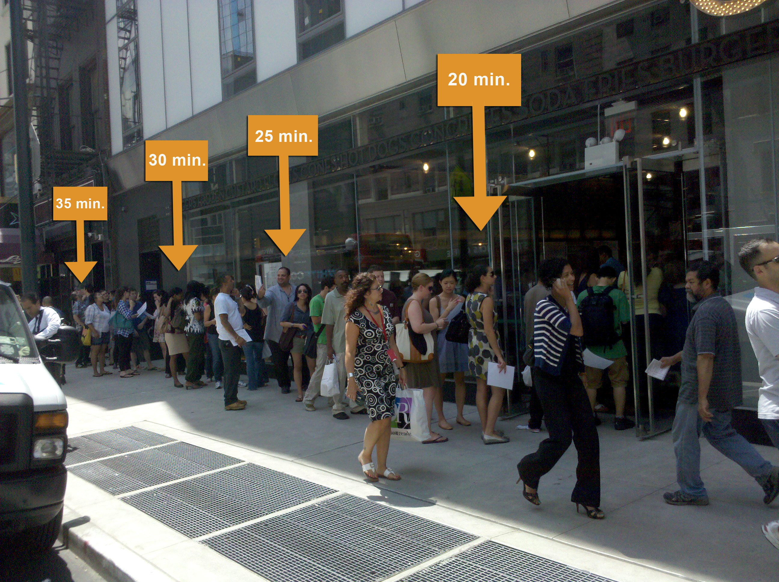 My 11:45 am trip to Shake Shack (on 44th and 8th Ave.) on Monday morning was smooth sailing (great for me!), but that relatively short line on the first real day of Midtown Lunch service wasn’t a very good indication of what the mob scene has now become. As the week has gone on reports have poured in between Noon and 2pm from the new Shack- and, no surprise, it can get pretty bad.  It’s only a matter of time before they Disneyland the sidewalk up with a rope line and “Your Wait Time From Here…” signs.  In the meantime, as a service to Midtown Lunch’ers, we have created a thorough guide to determining how long the wait is going to be.