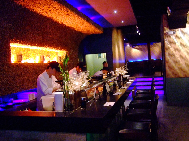 From 4 to 8pm you can satisfy your thirst with 50% off beer, sake, sake-cocktails, and wine. The décor is what you’d expect: hip and modern. There’s neon blue back lighting to the bar, sushi chefs milling around looking like they can sashimi any fish in the sea, and cute young hostesses that are eager to seat you and offer you a sake-tini. However there was one problem…