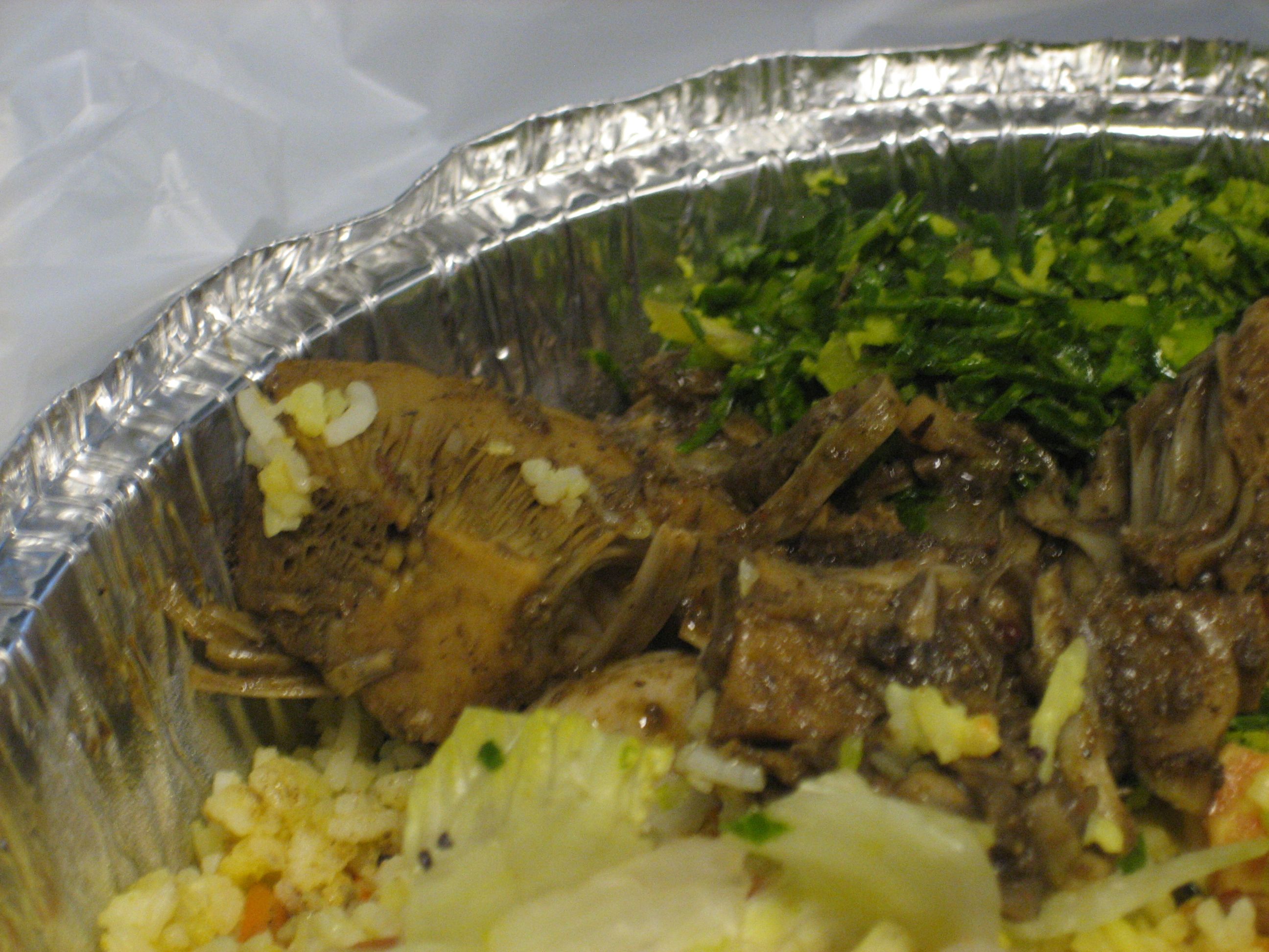 I also noticed this green leafy stuff. It looked pretty good so I asked if I could try it. They were happy to oblige (I think this is a case of a place that just wants to make customers happy, especially when they are new, so feel free to abuse their kindness). I’m not sure what this stuff was. Some sort of finely chopped, green, leafy vegetable. It was bitter, which is fine by me, but the small serving I had was more than enough. There just isn’t much flavor beyond the bitterness.