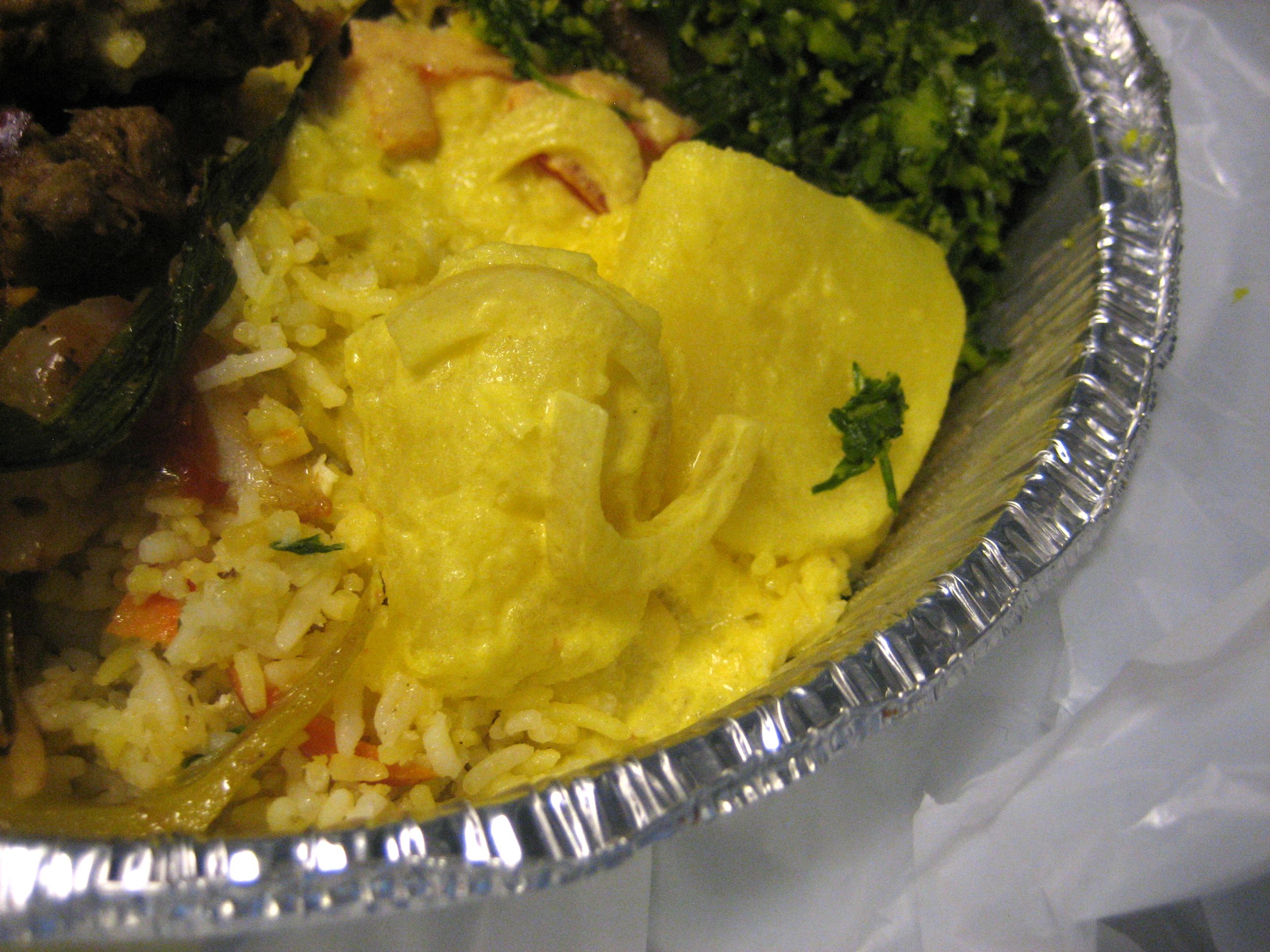 When the woman behind the counter told me this was Sri Lankan food, I excitedly began asking more questions, understanding only portions of most of the answers. So, excuse me if I’m a little foggy on some details. I believe the lunch deal is rice, potatoes, a meat and a vegetable. I can tell you with it’s definitely $5 and unlike any lunch you’ll get anywhere else in Midtown (that I know about).