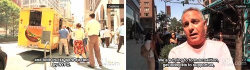 Following our coverage of last week’s spat between the Frites N Meats Truck and the Rickshaw Dumpling Truck the WSJ hit the streets of Midtown with a camera to interview a few food truck owners about the unwritten rules of street vending (aka you don’t park in another vendor’s spot). The video is mostly worthwhile, although focusing on competition between trucks parked next to each other is a red herring. (There’s also something funny and ironic about hearing Vadim from FnM talk about an understanding that trucks came too in the past year and a half- as if these unwritten rules haven’t been used by vendors for decades.)