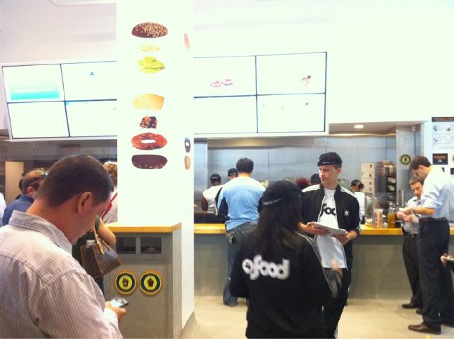 Earlier this month we had a contest giving away slots to a special preview lunch at 4Food, the crazy new social-media-meets-doughnut-shaped-veggie-stuffed-hamburger spot opening in September on Madison and 40th Street.  That free lunch is happening right now, and we couldn’t help but ask the winning lunchers to send us their thoughts in real time.