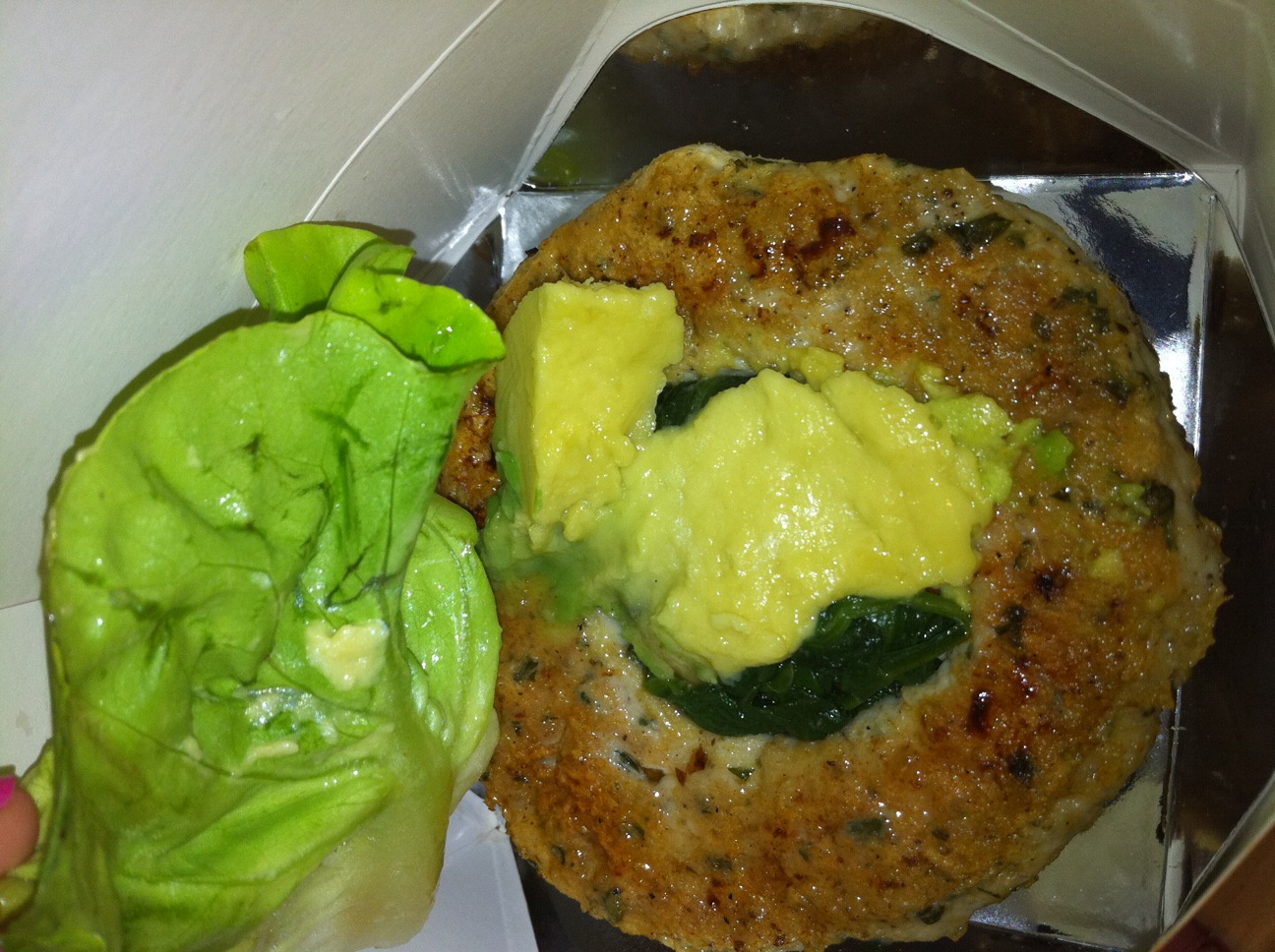 12:40pm – Ladies and gents… we have innards! (Courtesy of Lunch’er Jason) What the hell is that? (UPDATE: Jason checked back in to tell us that it’s “a turkey burger w/ the spinach and pine nuts as well as the avocado slice on a pumpernickel bun.”