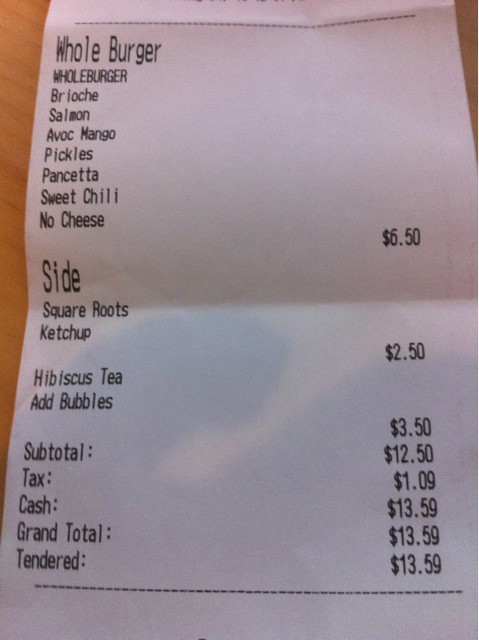 “From the swanky iPads and screens to the meal, 4Food comes across all look very little taste. I might come back for the root vegetables and drinks, but I’m not so sure about the rest. The service was good & the menu surprisingly Chipotle-esque. Peach bubble tea – surprisingly good bubbles for midtown, not too sweet. Square roots – crispy, nice, they don’t fulfill the french fry fix, but do work. Lamb burger on brioche with chorizo hash, avocado onions & manchego – um, where’s the cheese? Or avocado? The lamb tasted lamby, but overdone and SUCH a skimpy patty. The hash was a-ok, but mushy. And the bun was fast-food standard. Basically, I wouldn’t come back to fulfill a classic burger fix. Burgers should be simple, this isn’t. It also shouldn’t cost $12 for lunch.”
