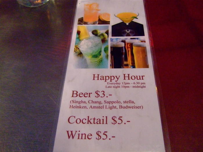 Happy hour consists of $3 beer, $5 cocktail, and $5 house wine. $3 for a Singha or Stella beer is a good deal, but house rules stipulate that one must order a $7-8 cocktail to qualify for the free grub. I asked if I could just order a few drinks to meet their quota for one free appetizer, but no luck. Undeterred, I got a drink and choose the spring rolls as my freebie.