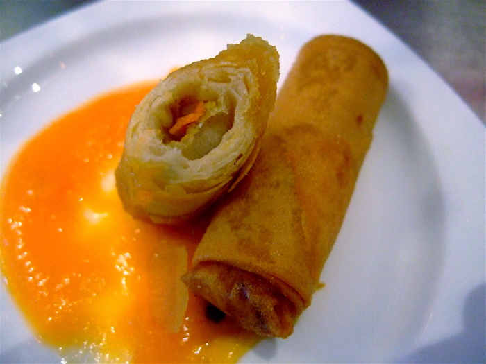 I was expecting a steamed rice wrapper filled with veggies, instead what I got was an egg roll the size of a Vienna sausage and fully deep fried. The only identifiable filling was some carrot and cabbage. I was a bit surprised to find a sweet carrot dipping sauce instead of the usual peanut sauce.
