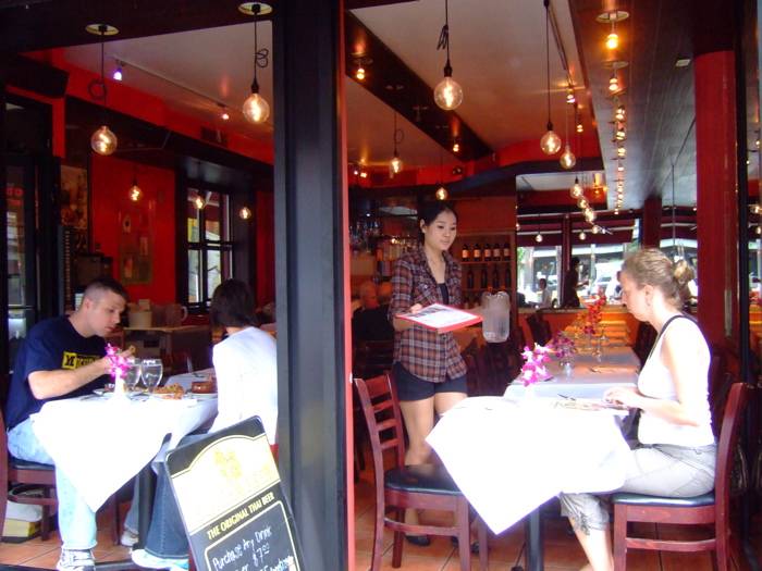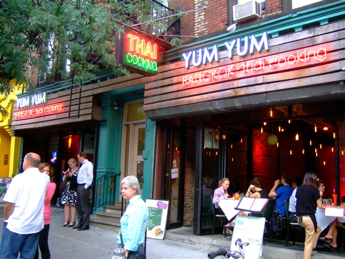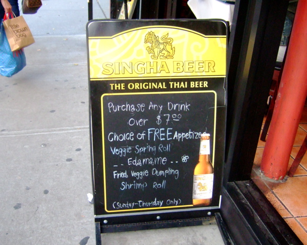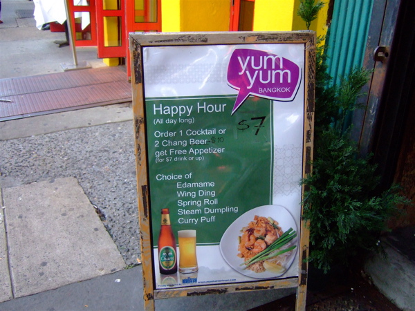 In addition to possessing a bounty of great bars with free snacks, 9th avenue is also home to the endlessly expanding Thai empire known as Yum Yum. What was once a single eatery has expanded to become Yum Yum 1, 2 and 3 –it’s tentacles spreading like an octopus between 45th Street to 46th Street (not that there is anything wrong with that…mmmm grilled octopus.) When I learned that along with tasty Thai they had food and drink specials I had to check them out.