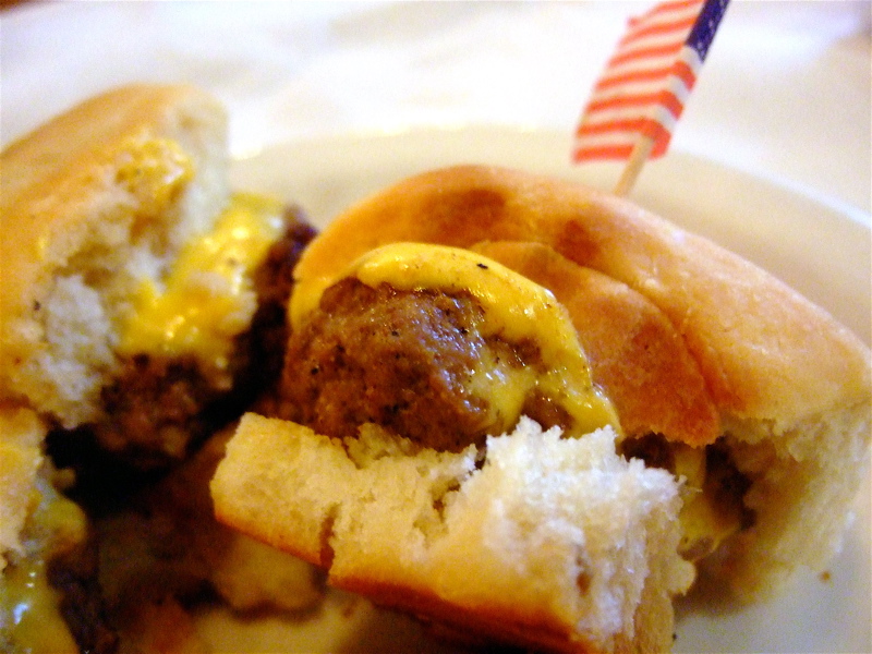 The plate came with 4 sliders with American cheese, a big lasso of a salt and pepper onion ring, and speared on top was a little American flag –we’re getting all patriotic up in this house! I requested the sliders rare. Yeah, that’s right, I asked for them bloody and pulsing. But really, after all these years of eating charred hockey pucks that pass as sliders I rather error on the side of a baby bison mooing at me, then eat jerky on a bun.