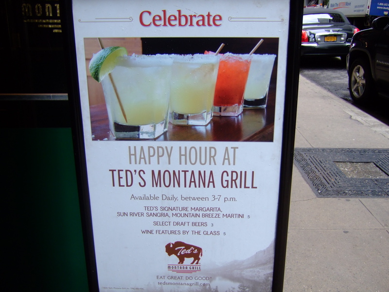 I’ve never been to Montana. I don’t know anyone named Ted and most of all I tend to avoid places with gimmicky “take ya’ll back home” themes. They tend to disappoint. So why would I visit Ted’s Montana Grill? Could it be that I secretly wished to be where the buffalo roam? Could it be that deep within myself I yearned for a place where a woman can truly live free? Could it be that there was a massive void in my soul that only Big Sky Country could fill? Naah, it was probably the sign that advertised $5 signature margaritas and $3 draft beers from 4 to 7pm.
