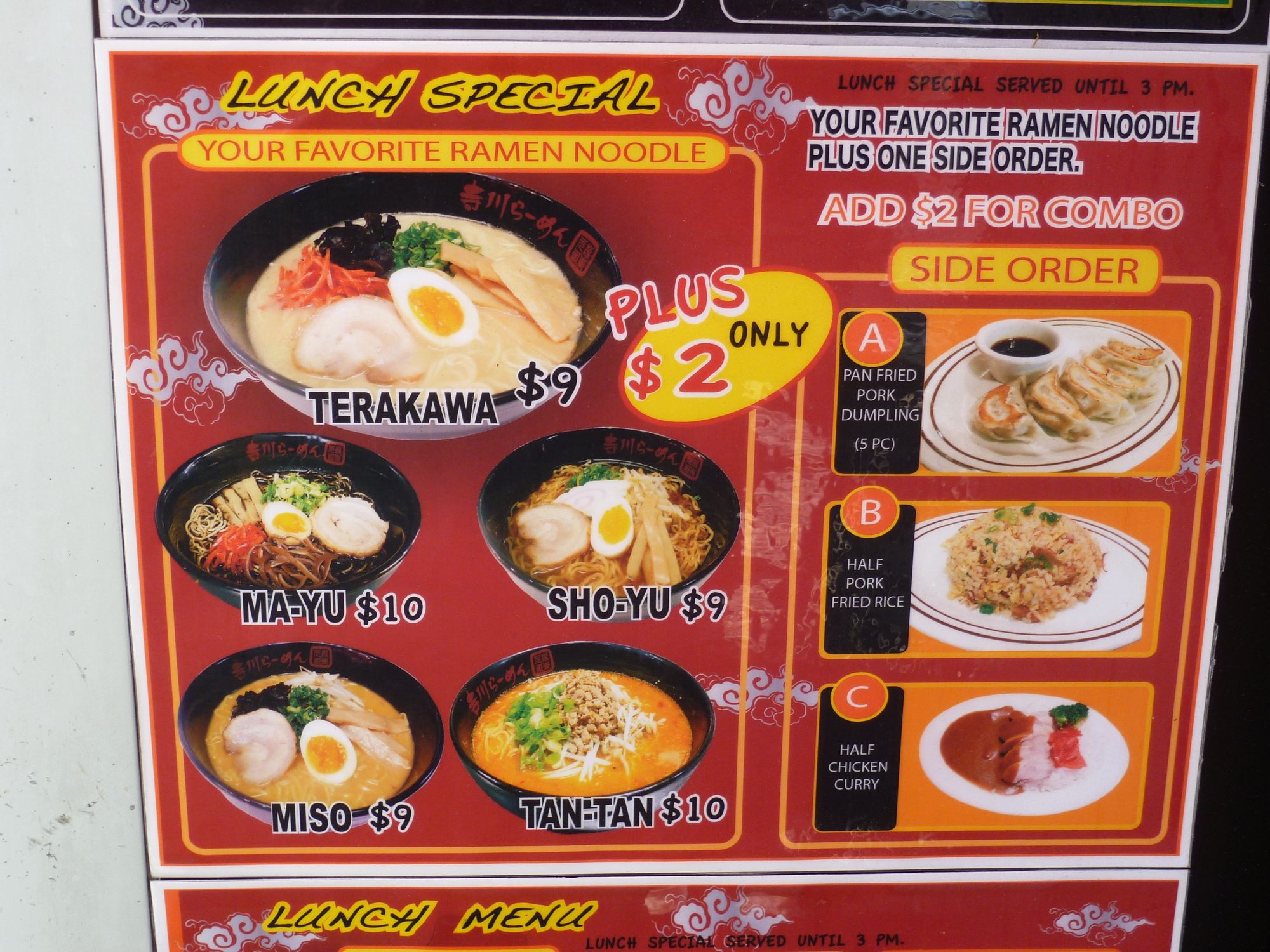 The small bar was empty when I arrived around 12:30, but quickly filled up by the time I finished my meal. For lunch, they offer one of five ramen soups for $9 or $10, which could include a side order (choice of Pork Dumplings, Pork Fried Rice, or Chicken Curry) if you want to fork over an extra 2 bucks. It looks like a deal but when the bill comes, you realize how quickly it all adds up. Forget it if you were hoping for a soda!