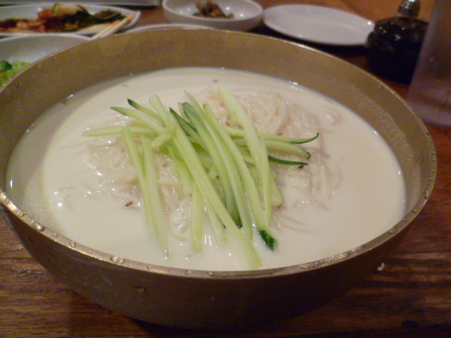 Last week I got an email from Tasting Table alerting me to a special summer dish at Koreatown favorite Kunjip. Kong Gook Soo is a Korean soup I had never encountered before consisting of a ground soybean broth, cold noodles, and cucumber slices. Tasting Table called it “air-conditioning for your insides.” I’m a glutton for air conditioning and new, unusual dishes, so I figured I’d stop by to get a taste.