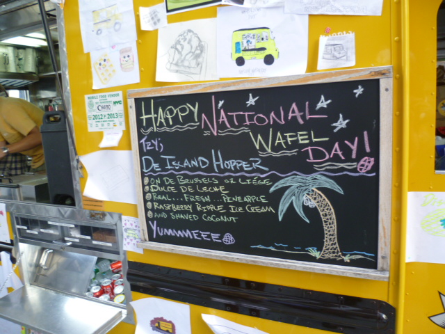 I missed most of the Waffle Day festivities, including the crowning of Mr. and Mrs. Wafel, but I did get to see all the waffle-inspired art work created by customers taped up on the truck. It looked like an elementary school classroom. And I also got to sample their latest concoction: De Island Hopper.