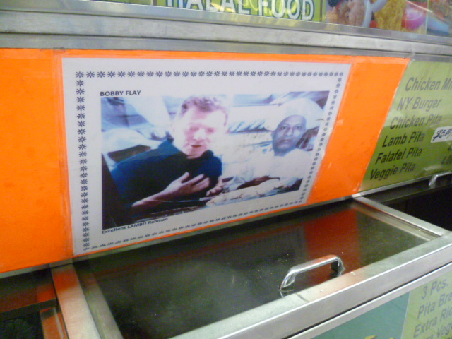 Anybody who’s been to the Kwik Meal cart lately has most likely noticed the photo of owner Muhammed Rahman with celebrity chef Bobby Flay taken from the Throwdown episode where Bobby beat Taim with Kwik Meal’s falafel recipe. And anybody who reads this site on a regular basis knows about the family feud between Muhammed and his brother, who operates the neighboring Fahima Halal Cart. Over the last few years, Fahima has done everything to lure customers away from Kwik Meal- including serving practically the same food. But their latest shenanigans might be the most ridiculous stunt of all…