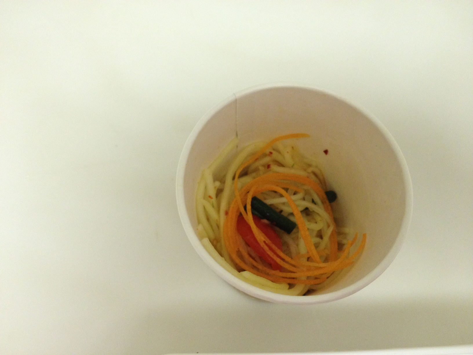 Like many Thai lunch specials you start with a few appetizer options and then you have the many dish styles that can be mixed and matched with different meat or veggie options. I decided to order the green papaya salad to start, with the Thai basil chicken and brown rice as my main. A friend ordered the tom yum puk soup and the lava chili with shrimp and white rice. We both requested medium spicy (more on that later.) If you can’t read the menu above with all the glare, you can find the full menu on Jaiya’s website. (Warning: make sure your computer speakers are off or at least low before going to the site; they have terrible elevator/porn music playing on the site which might cause concern at the office.)