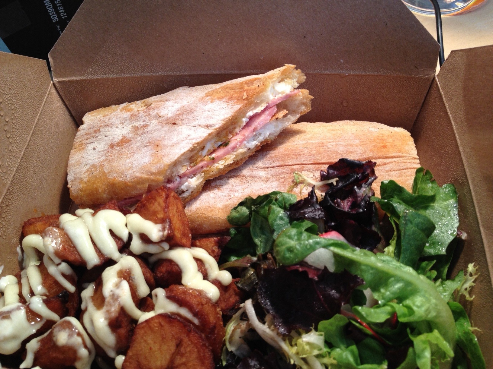 Okay, now onto those hot potatoes. All sandwiches are served with patatas bravas and a small lightly dressed salad. They were crisp and seasoned, on top of a delicious tomato-y, spicy, red sauce (as they call it “salsa brava”) with a layer allioli (which according to Wikipedia is “the Catalan variant of the garlic sauce Aioli”). Yum. Despite the fact the heat of the patatas wilted my salad greens, they were still a welcome addition to the meal.