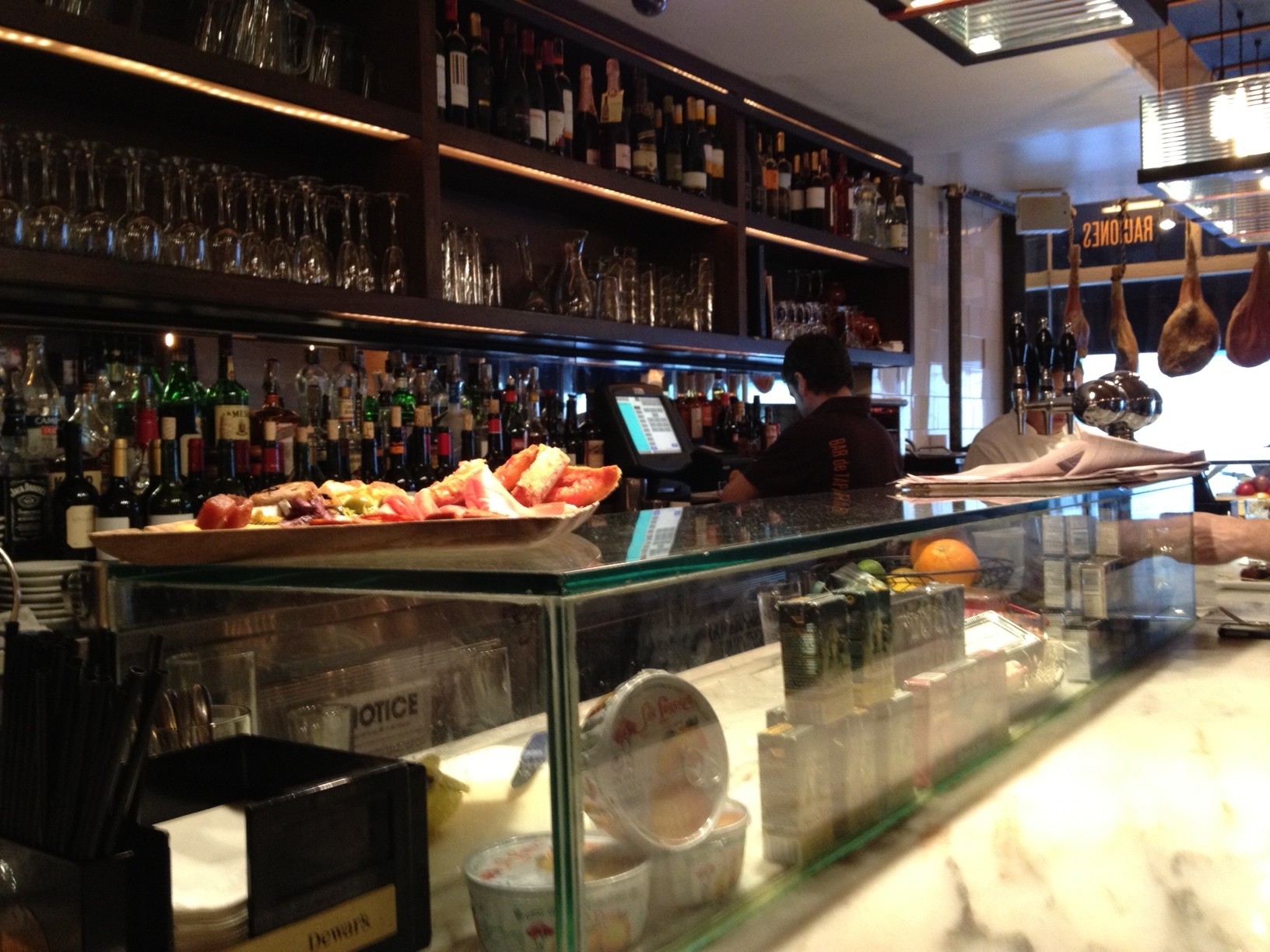 The interior has a very welcoming and effortlessly casual feel. It is chic without trying too hard. While picking up my food, a mouthwatering patter of sliced meats, cheeses, olives, quince, pan con tomate…the full spread…went out to a table (you can see a bit of it in the photo). When I told the guys behind the bar that the platter looked beautiful, they were eager to tell me that it could be prepared to-go. Pretty sure it isn’t in the ML budget, but good to know. For those of you who have had the pleasure of going to the real Boqueria in Barcelona, no need to rub it in. It is bad enough that while preparing this post, gmail, using their evil/brilliant spying technology, posted ads for flights to and hotels in Spain.