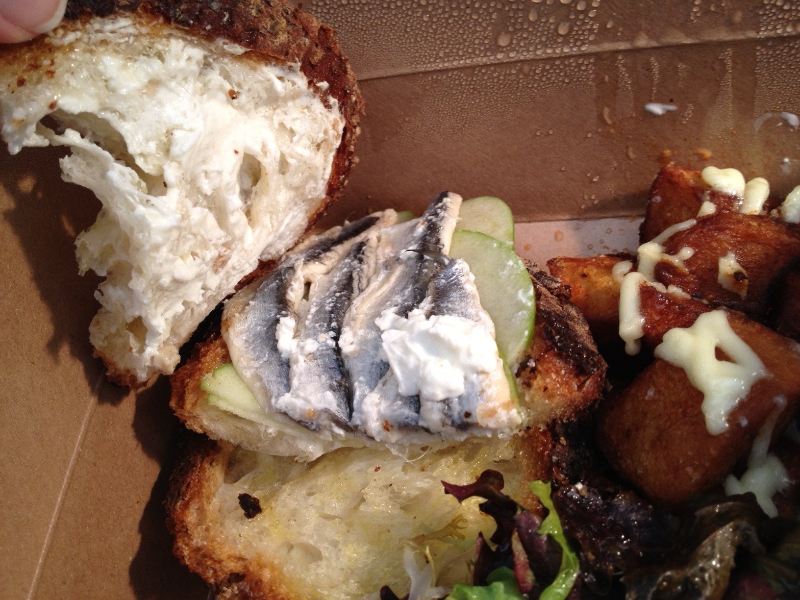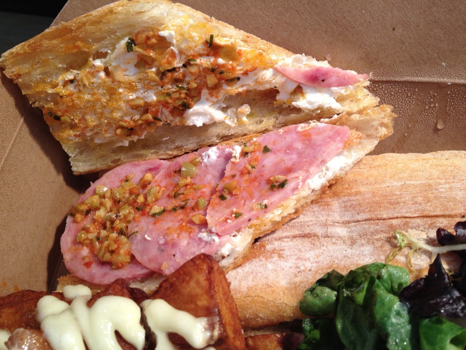 The ordered the Bocata de Boquerones and the Bocata Butifarra y Olivada, two of the five sandwiches on their menu that are $10 or under. (Bocata means sandwich.) According to the menu, four of the five options are considered cold sandwiches, but the anchovies come on toasted bread, so that is an in between-er in my book. Also, since they are packaged with hot potatoes (more on that later), both of my sandwiches were hot by the time I ate them. I’m not complaining.