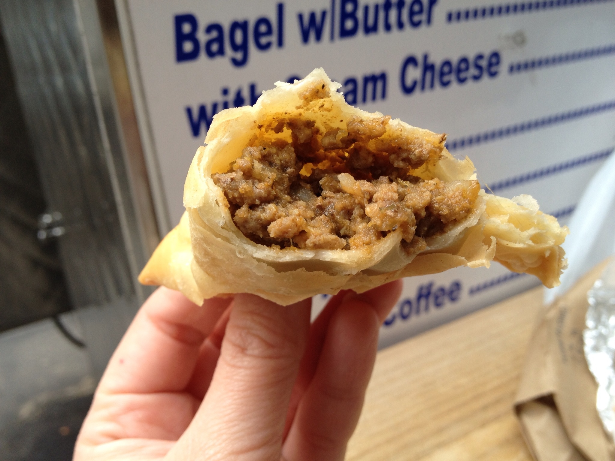Brother’s Express is kinda the deli of trucks – they have a little bit of everything. And it isn’t a small push cart either, it is a fully decommissioned-Postal-truck-sized truck. The menu is a little bit all over the place, figuratively and literally. I knew they featured Latin dishes thanks to a little research, but they also have a large selection of “grill items”; burgers, grilled cheese, hot dogs, Philly cheese steak, turkey burgers. The lunch menu consists of over-sized photos with the dish name and price which covers most of the exposed street-side of the truck. Normally, picture menus would make things much easier (how could they not?), but somehow, I overlooked Tacos several times. I had my heart set on Mexican food and there was the lack of sandwich chalkboard with specials (see research above), but there was a smallish white paper sign in the truck window the read “Empanadas” – SOLD! Don’t forget near the back of the truck is a separate menu listing of breakfast items and drinks.