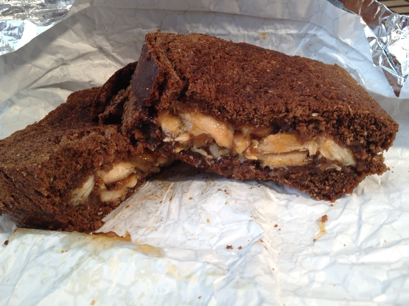 The first sandwich I ordered was the Chicken with Mango Chutney (for $7.95), and I was given the choice of white or wheat bread. Immediately, the employee behind the counter roughly chopped the chicken and threw it on the flat griddle of the sandwich press for a couple minutes before compiling the whole sandwich. I am pretty sure the extra sear contributed to the overall flavor of the sandwich. It also probably helped the sandwich reach a nice warm temperature in the toasting process since I would guess the chutney started cold. When I ordered, the bread was sliced fresh into huge Taxas Toast size slices from a large loaf. The sandwich had a nice combo of flavors, but I think the bread stood out as the most interesting part of the dish. The wheat bread was similar to brown bread and had a lovely nutty taste.
