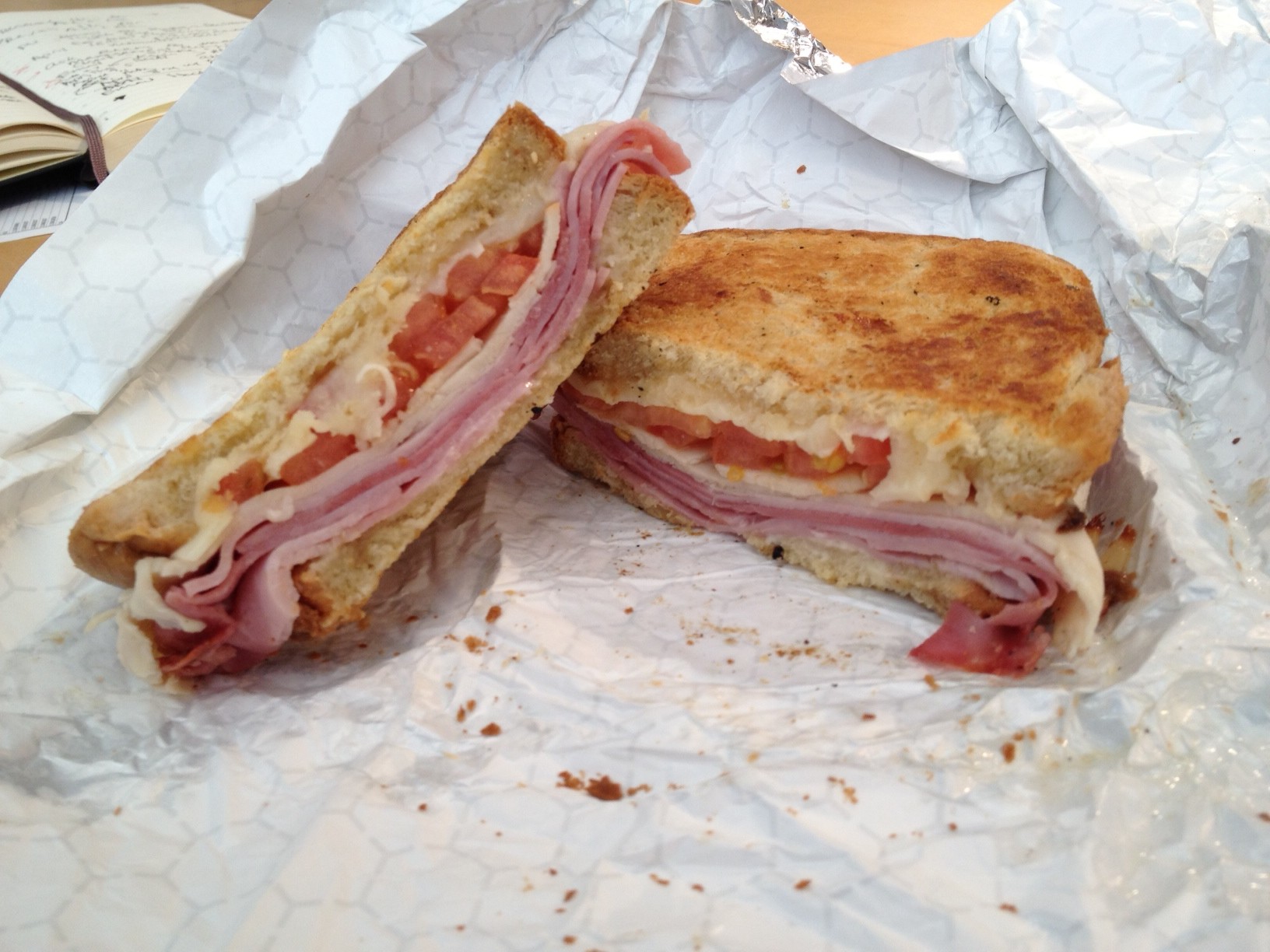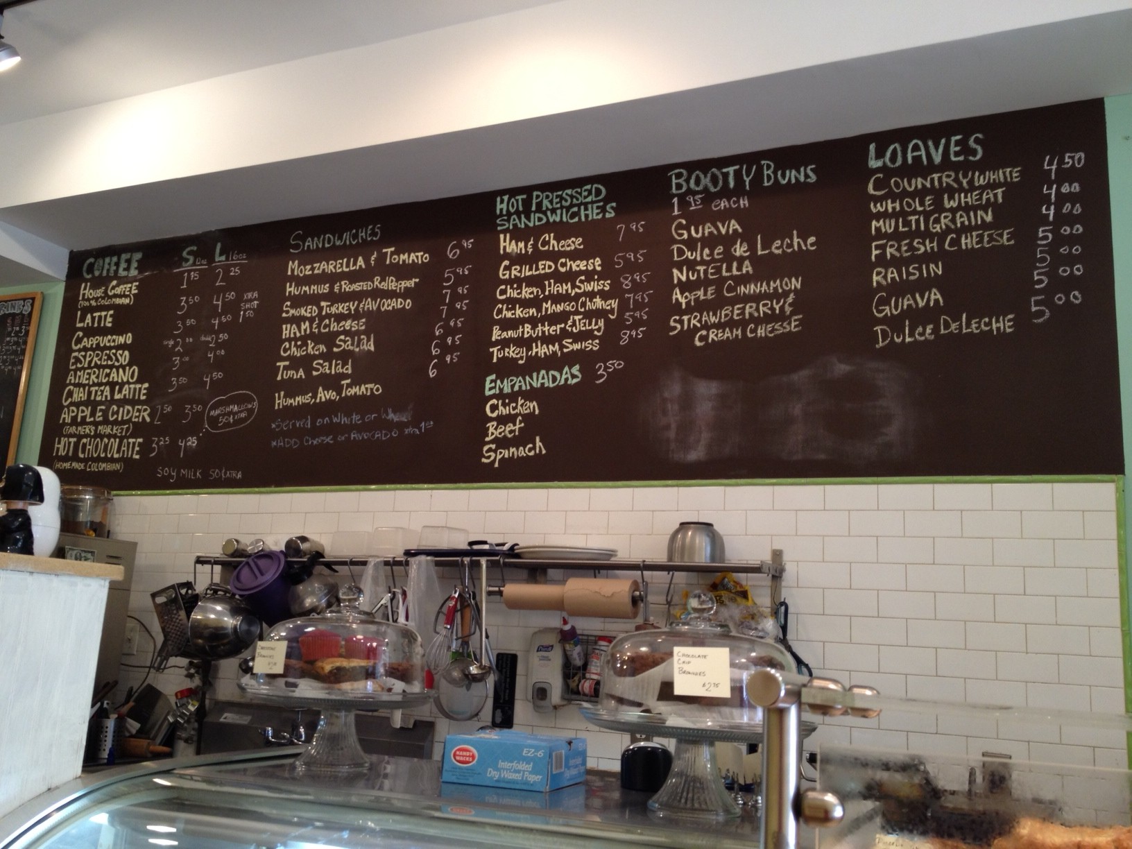 The logo would suggest that the name is meant to be a comment on the owner’s physique. But after seeing all (and tasting some of) their baked goods, it takes on a double meaning of what will happen to your derrière if you partake too heavily at the Big Booty Bread Co. (hereinafter referred to as the “BBB Co”). BBB Co is a Latin bakery and coffee shop with a selection of hot and cold sandwiches. When I was there, everything took a while since they only had one guy behind the counter. In fact, another customer had to wait a few minutes to get his coffee and pastry while my sandwiches were being built and put on the sandwich press. I should mention that the employee was wearing a t-shirt that read “I Heart Big Booty”.
