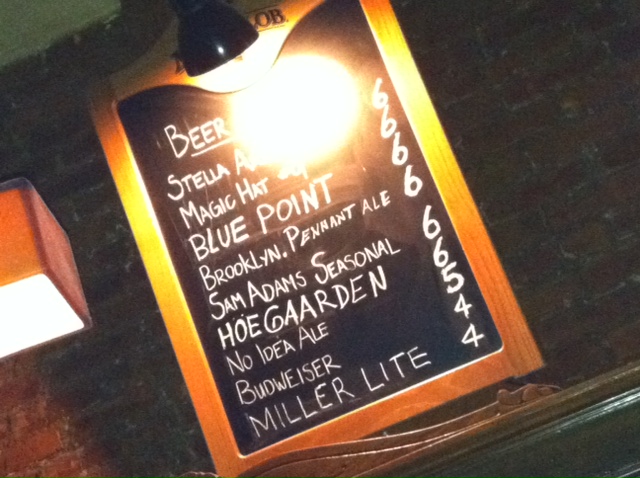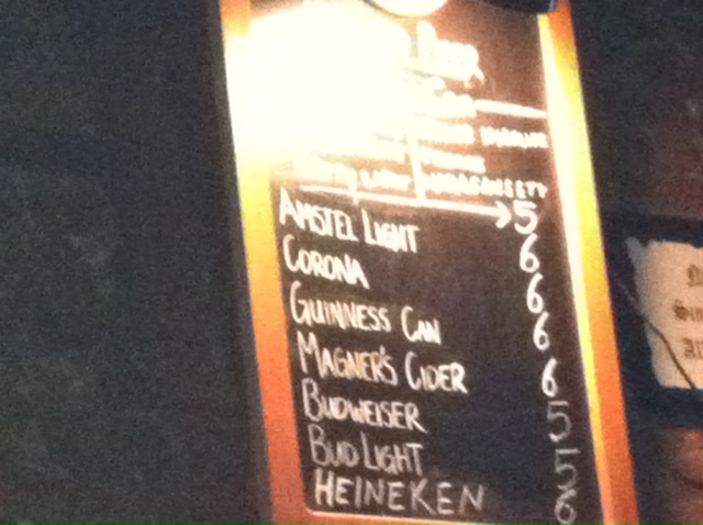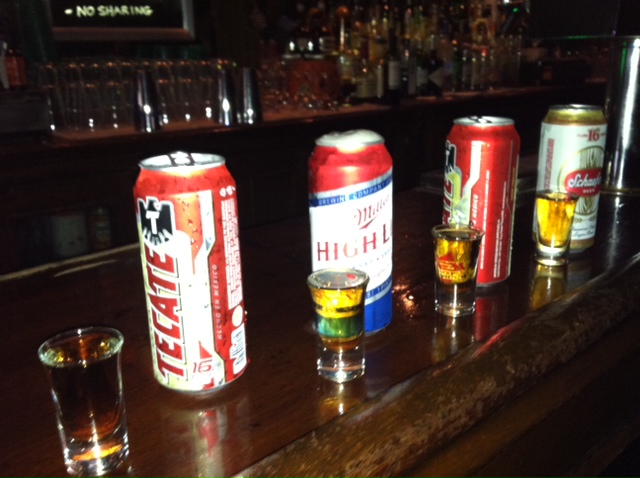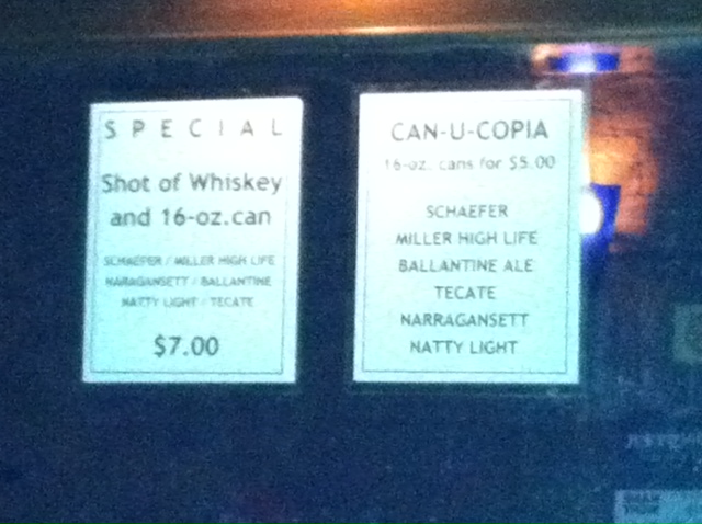 Our first wave of happy hour-goers went with the “shot of whiskey and a 16 ounce can” special for $7. For those not needing the extra “boost,” $5 will get you a 16 ounce can of Schaefer, Miller High Life, Ballantine Ale, Tecate, Narragansett or Natty Light (yes, the same Natty Light we all, or at least I, remember a little too well from freshmen year of college).