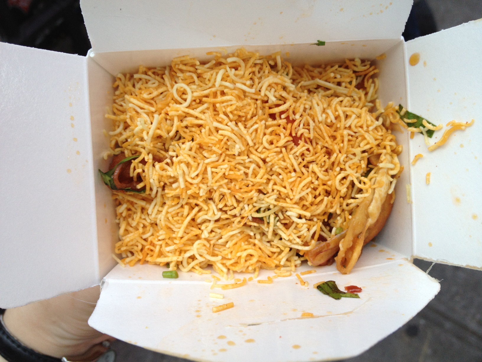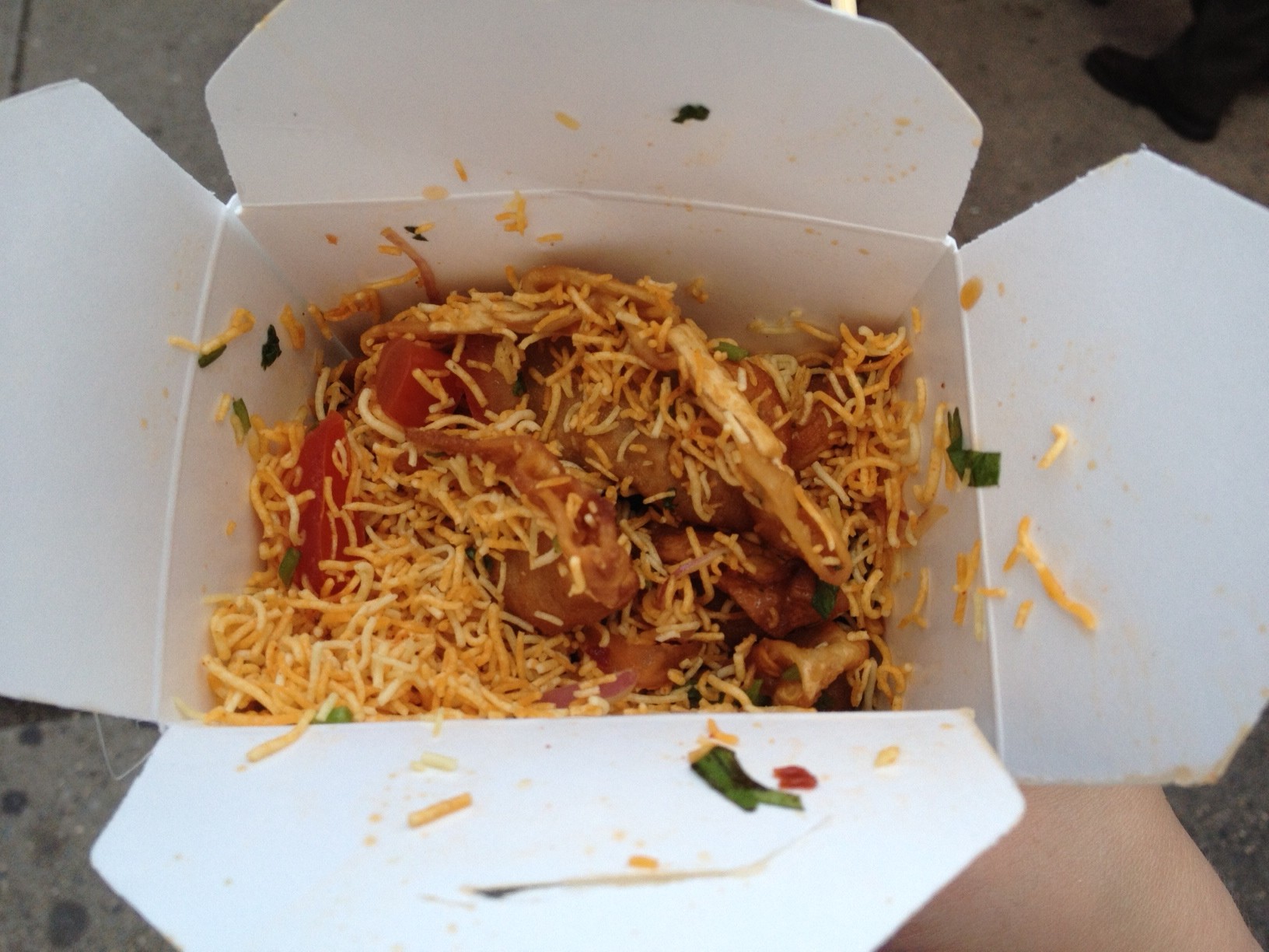 Well, it wasn’t. It was almost exactly as the menu says, and not what I wanted it to be. The chaat came in a Chinese takeout container with a soy based sauce on the bottom, seven pork dumplings, and topped with aloo bhujia and a salad of diced red onion, tomatoes and cilantro. The aloo bhujia, a spicy Indian potato noodle crunchies, combined with the salad was my favorite part of the dish. (It was actually really good.)