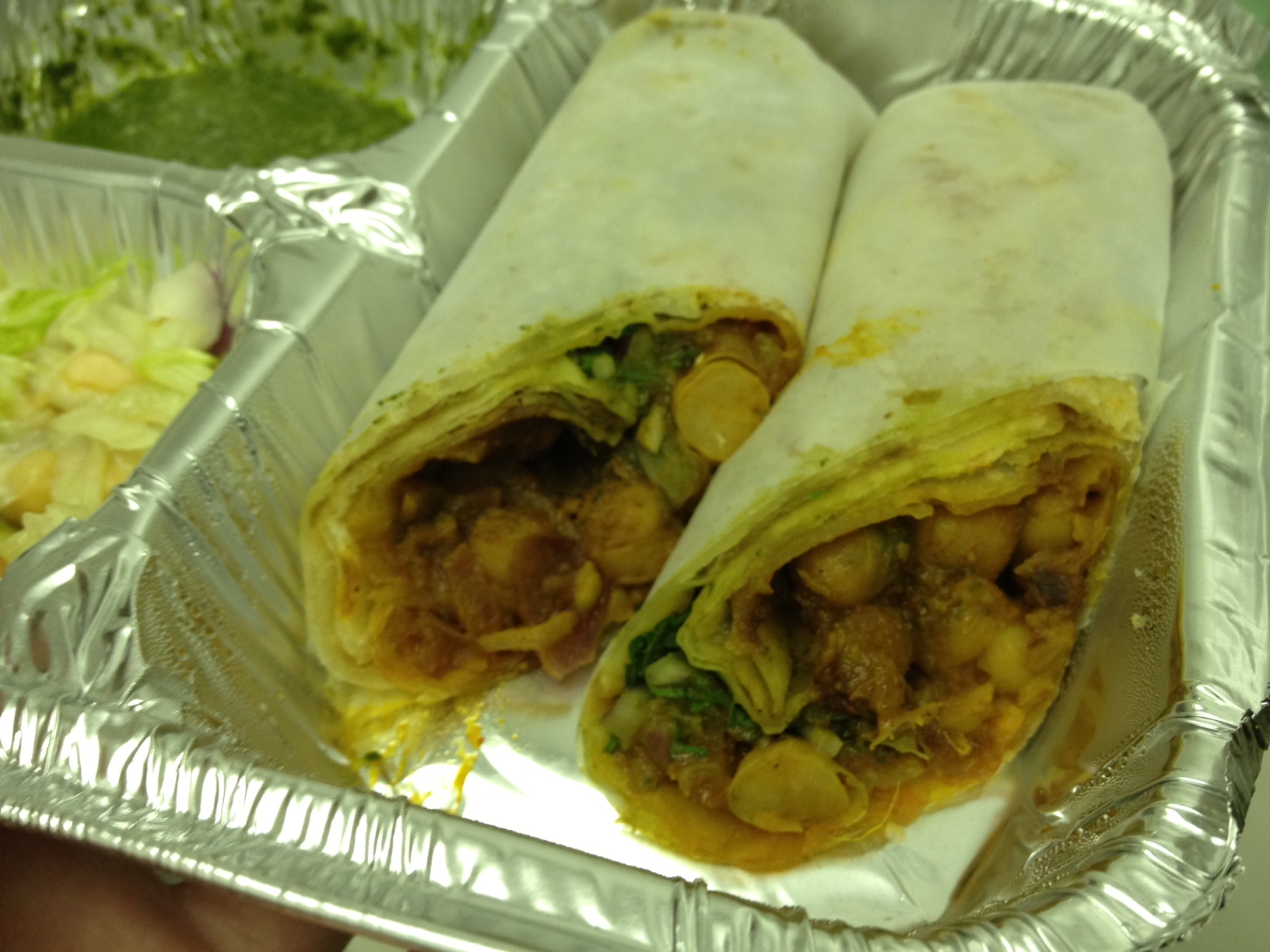 But wait, there’s more. I also thought it was only fair to try a vegan roll, so I also got the chana (chickpea) roll. This roll also started with some freshly cooked red onions, which was added to one overflowing handful of chickpeas and sauce. The sauce that was included with the chickpeas made this one of the most flavorful rolls.