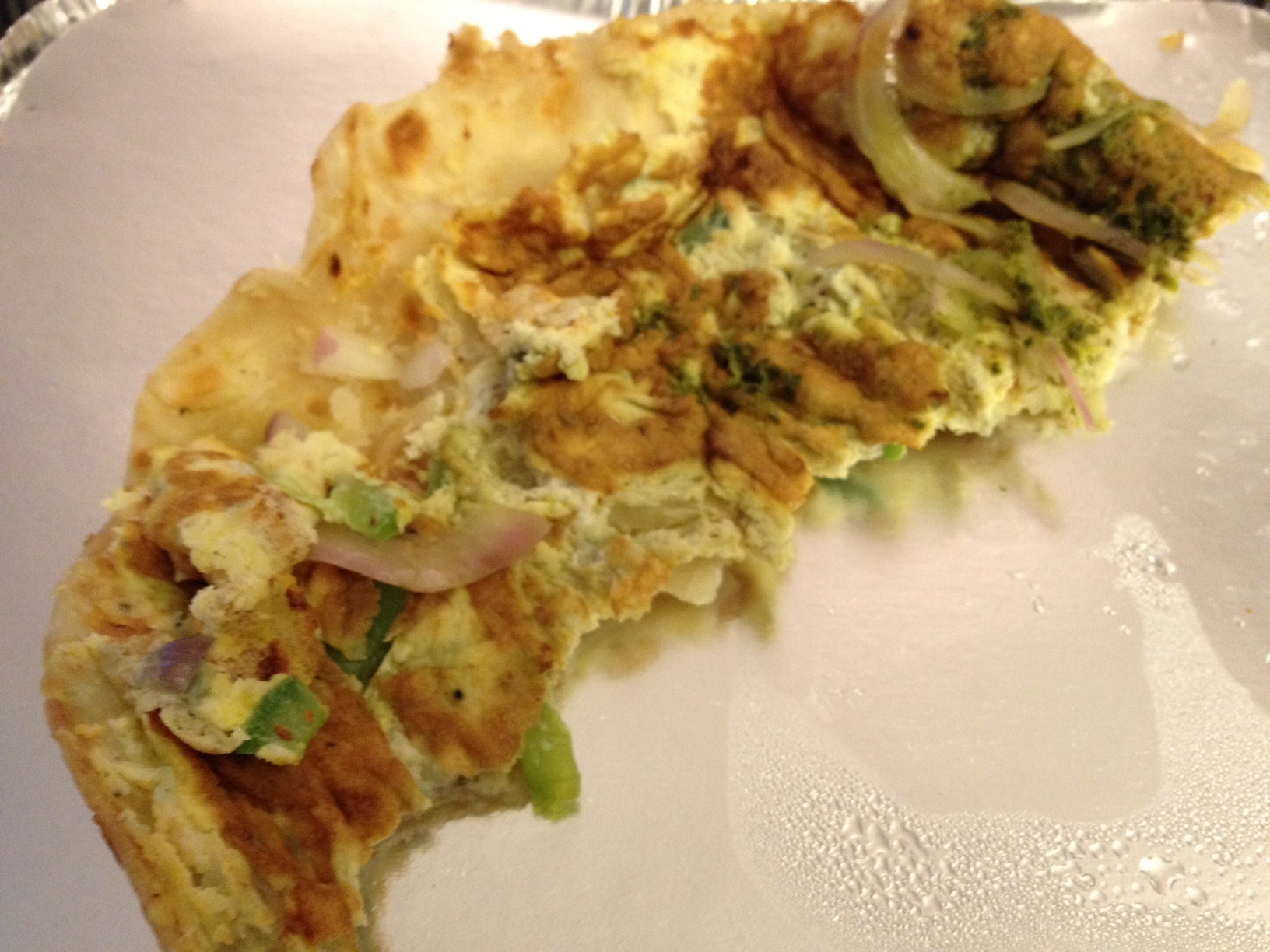 For the galli omelette roll I ordered, I wasn’t as closely paying attention, but I think they also cracked and scrambled the eggs adding onions, peppers, tomatoes and green chilies (according to the menu,but I didn’t taste the heat of green chilies). All these items were cooked together in a huge round patty on the griddle.