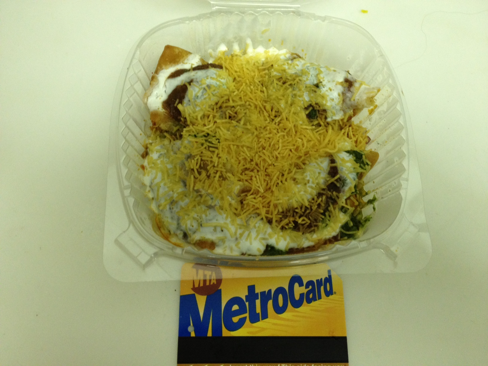 The first “small chop” I tried was the samosa chaat. I know I have previously mentioned my love for the Indus Express samosa chaat, so I have been searching for an equally awesome version in the Flatiron District. Desi Galli’s included two potato and pea samosas broken in half over a bed of chickpeas, chopped red onion and red peppers. I also noticed some coriander (aka cilantro) seeds, which are tasty bites when you get one. The whole dish was covered with a nice layer of coriander chutney, tamarind sauce, and fine crispy noodles. It was very tasty with a combo of spicy and sweet, hot and cold. I had to force myself to put it down to try the other items I ordered.