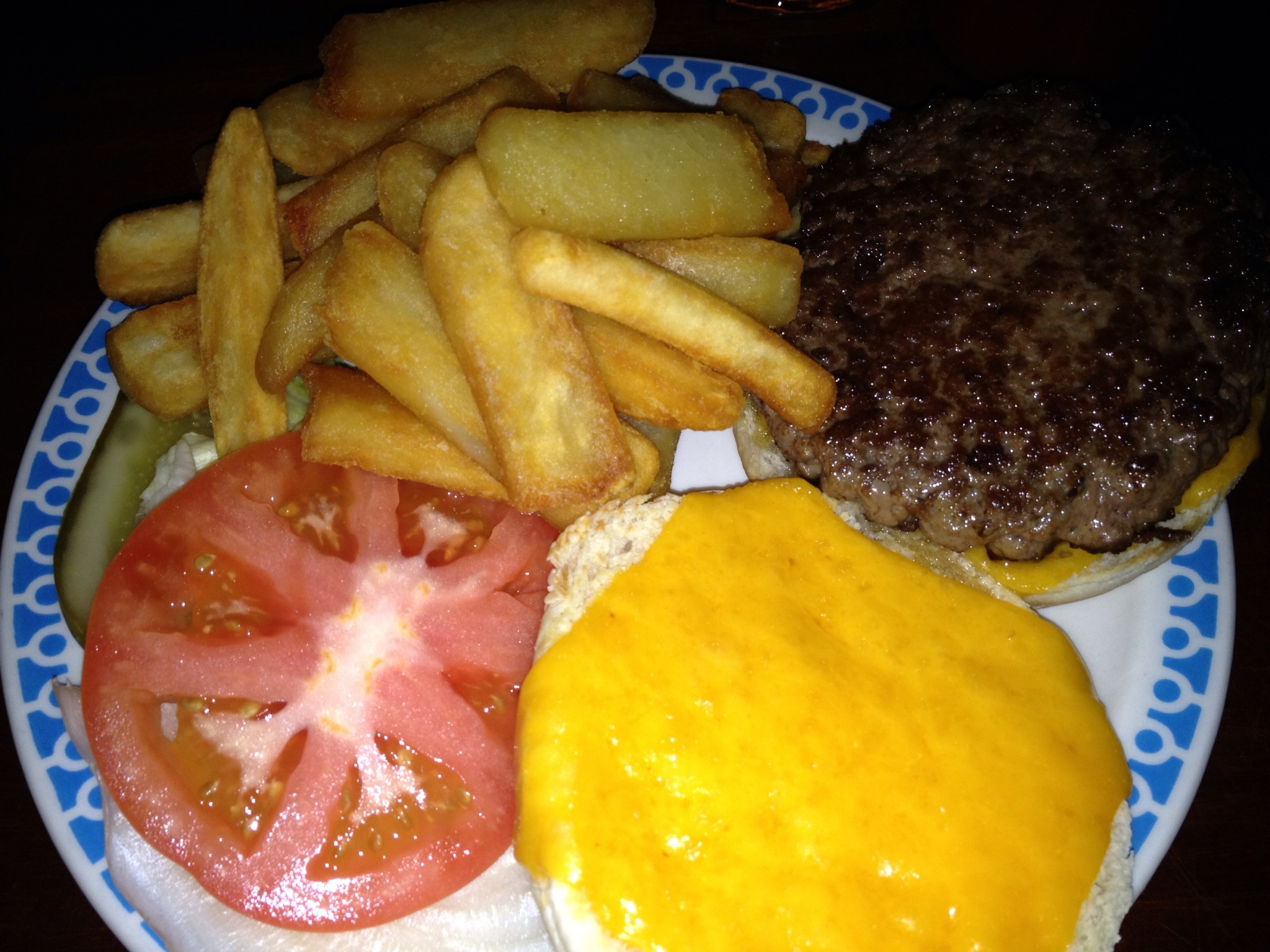 I don’t remember exactly when I noticed their massive lunch special signs out front, but I was drawn in by the “Berger and a Burger” (Radeberger and a cheeseburger) for $9. Radeberger is a nice crispy German pilsner that goes really well with greasy food.