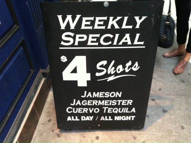 Happy hour includes $4 pints of Stella, Blue Moon and Bud Light Monday through Friday between 5 pm and 7 pm. Additionally, $4 shots of Jameson, Jager, and Cuervo are available all day and night, making this place slightly more “dangerous.” (The ladies I mentioned before were taking advantage of this weekly special.)