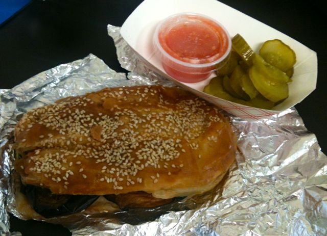 Understand that before today I had never tried a sabich (eggplant and hard boiled egg sandwich on pita bread) or a burek (stuffed pastry topped with sesame seeds that happened in this case to be filled with cheese), and Brian didn’t seem to be a huge fan of their regular sabich. But once you replace the pita bread with a bureka all bets are off. There was no question this thing was the most interesting thing on the menu.