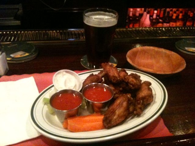 The menu consisted of reasonably priced but typical pub fare, with a handwritten page of daily special entrees ranging from $10 to $20. What stood out to me was their appetizers — they seemed to have decent prices on those with onion rings at $4.95 and mozzarella sticks, chicken fingers, potato skins, and Buffalo wings all at $6.95. And, it’s almost *all I can do* not to order wings when I go to a bar that has them on the menu, so I gave in to my borderline addiction and got ‘em.