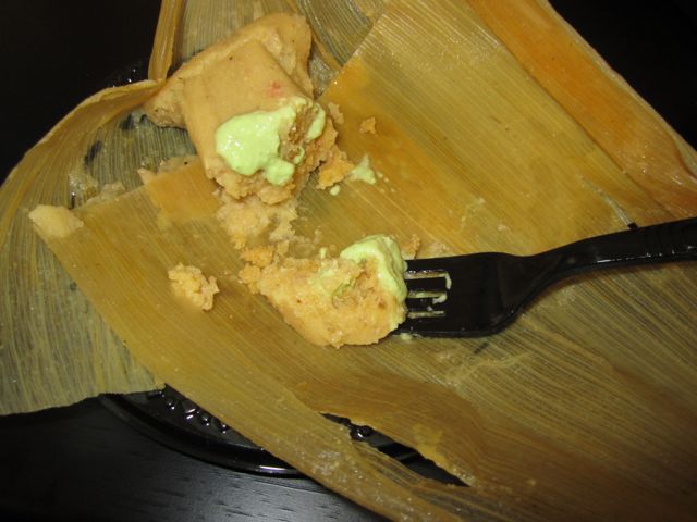 So I’ve been jonesin’ for some tamales, no lie. They’re cheap, tasty, and very filling–think 6 bucks to feel like you have big ol’ corn brick in your belly. But I hadn’t seen many places around midtown. But one day I looked through the window of Sophie’s Cuban Cuisine (the one between 45th St btw 5th + 6th) and I noticed they had some corn husk wrapped tamales for sale! So I grabbed a few of what I now know is a Cuban-style tamale.