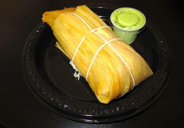 The best thing about Sophie’s tamales is the flavor. But don’t forget to ask for hot sauce… the wonderful heat of Sophie’s “Peruvian aji-like” green sauce — which was extensively covered by Midtown Lunch back in 2009, balances the sweetness of the corn perfectly. I asked the lady checking me out what the ingredients are, and she said, “jalapeno, olive oil, and garlic”.