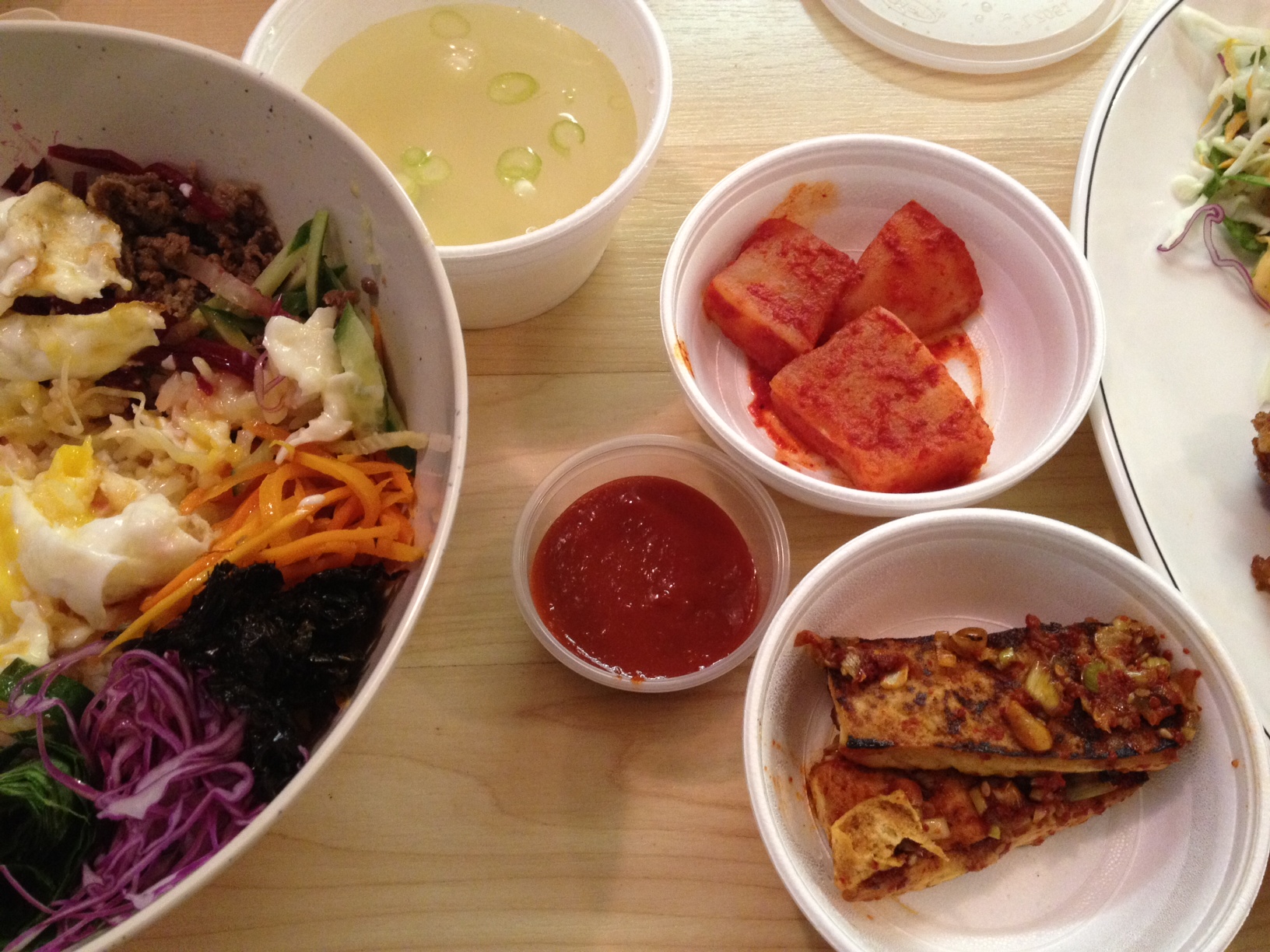 The bibimbap is not served with the ubiquitous cabbage kimchee (at least not the day I ordered.) Instead, it came with a side of seared tofu with scallions and spicy sauce, pickled radishes, Korean hot sauce, and soup. The soup tasted similar to salt water with a little scallion flavoring, but the tofu was outstanding. I would order just that as a meal with a side of rice.