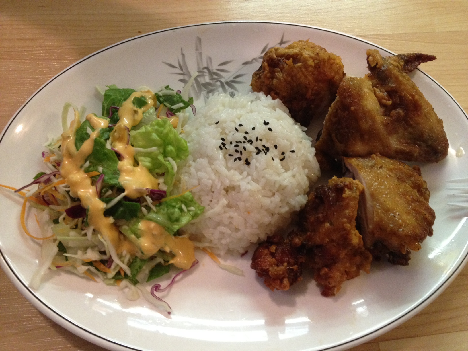 The other item I got was listed on a yellow sheet of paper stuck to the column next to the register that read “fried chicken special with rice and salad -$5.95”. I asked about the dish and was informed that it is a secret recipe. The plate arrived with four pieces of bone-in, skin-on fried chicken. I am not sure I can guess the secret spices they add, but it was delicious and was the first thing my friend and I finished. The skin was awesomely crispy and the chicken was not at all dry. The salad and rice were mostly filler, but I would go back for the chicken.